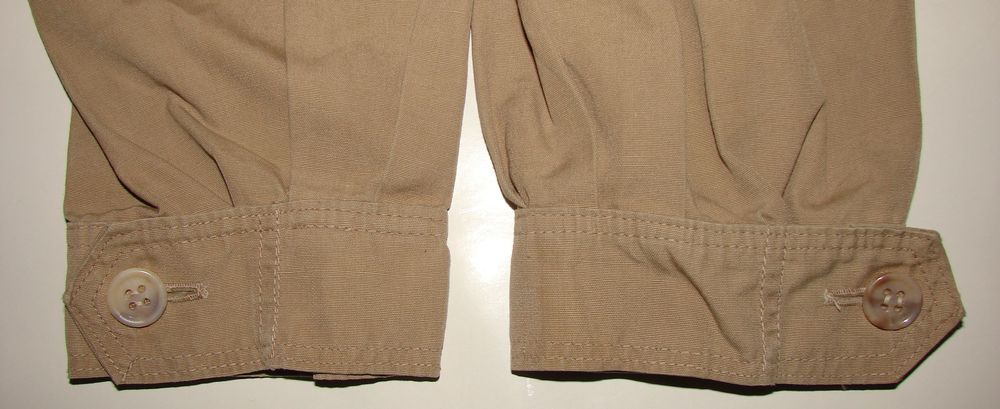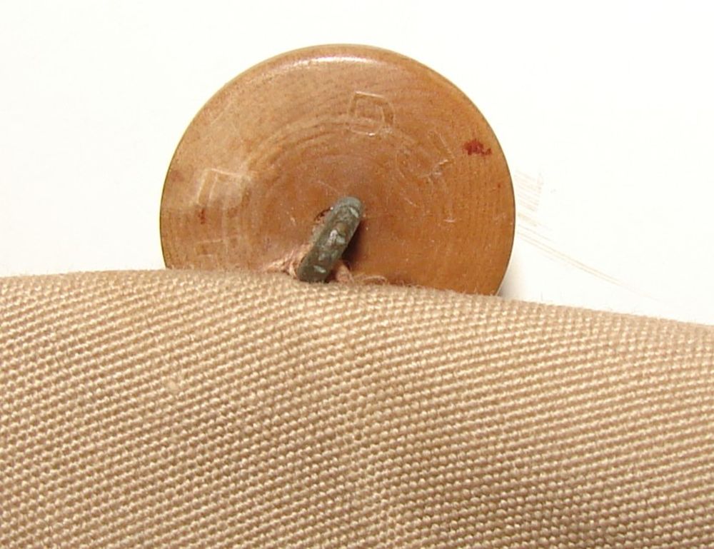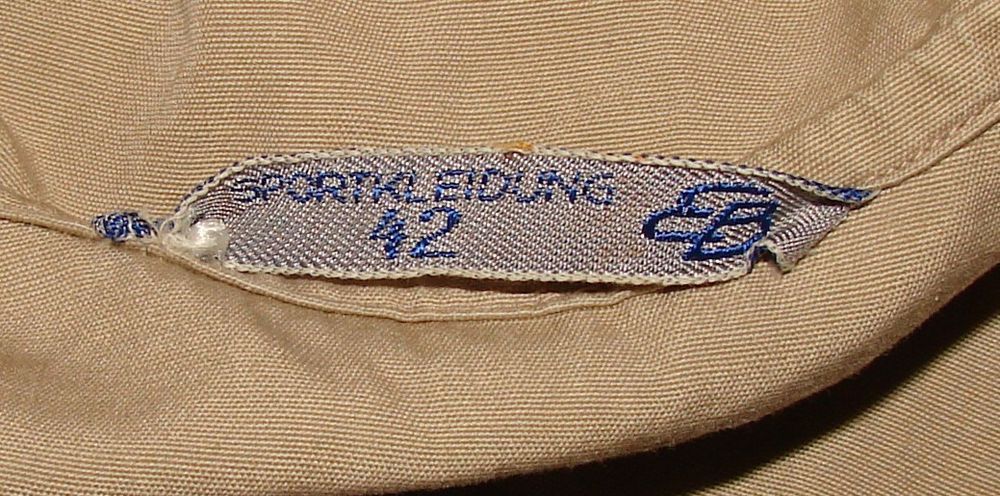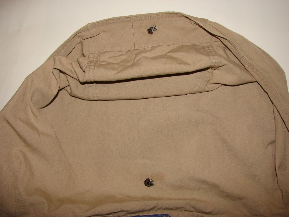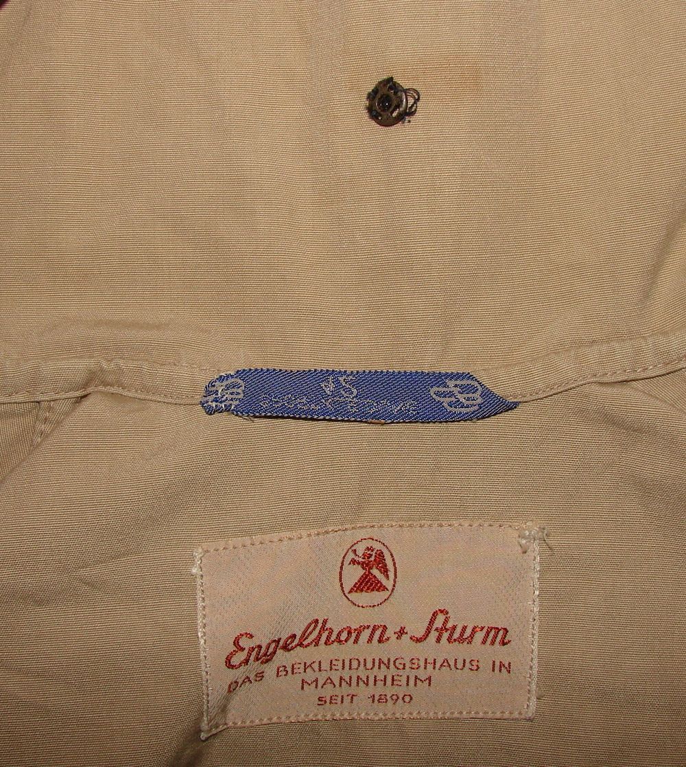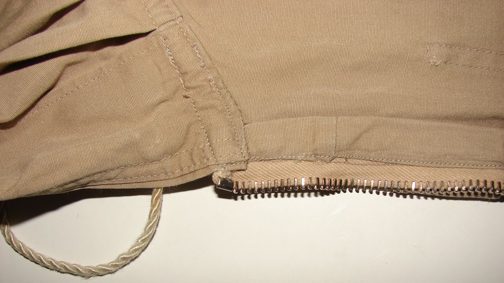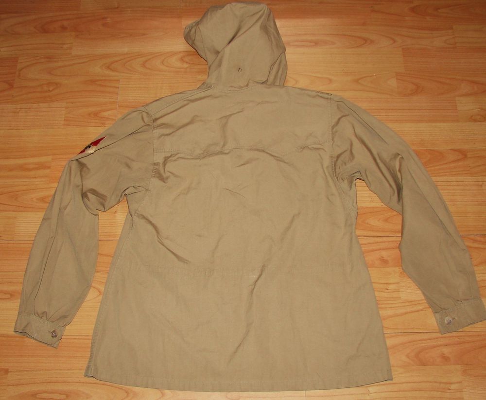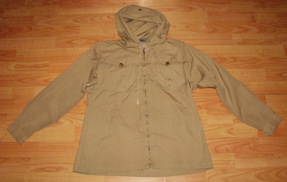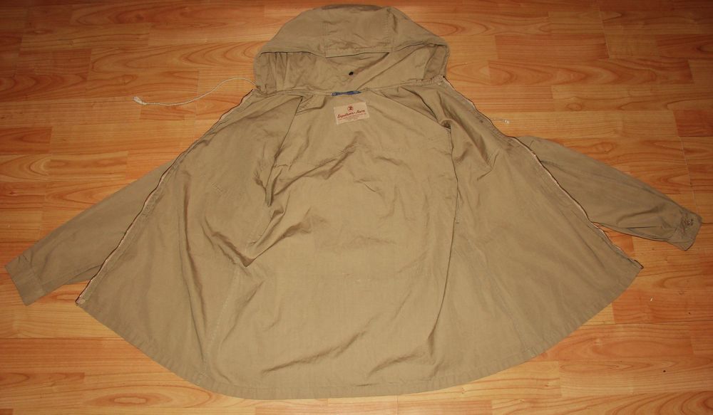 Anorak de la Hitler-Jugend en toile de coton couleur sable, l'insigne HJ cousu machine à la manche gauche, étiquette du fabricant "Engelhorn + Sturm" à Mannheim. Boutons de poche de poitrine marqués "HJ-DJ, Hitler-Jugend, Deutsches Jungvolk". Fermeture à glissière civile de marque RIRI. Une bride de décoration sur la poche gauche. Un bouton pression dans la capuche, une cordelette de serrage.