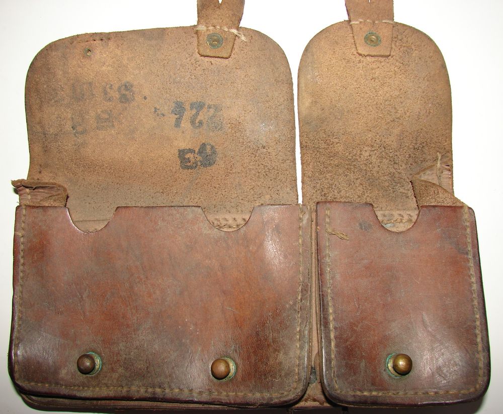 Cartouchière modèle 35 modifiée 37, avec plusieurs tampons à l'encre " 63, 224, 33,10" et trois "R" frappés dans le cuir sur les rabats, pour REJET, très certainement pour la patte de fixation manquante sur la grande cartouchière, qui devait déjà être absente le jour du contrôle.
