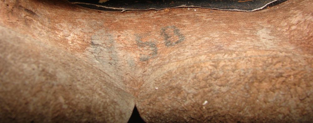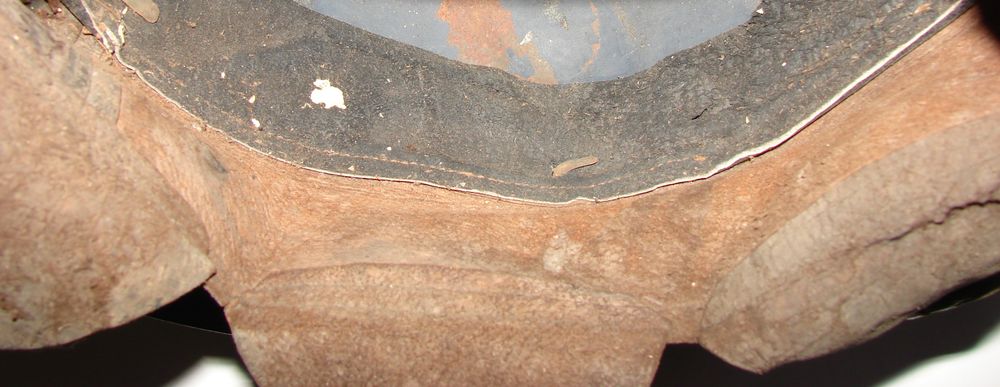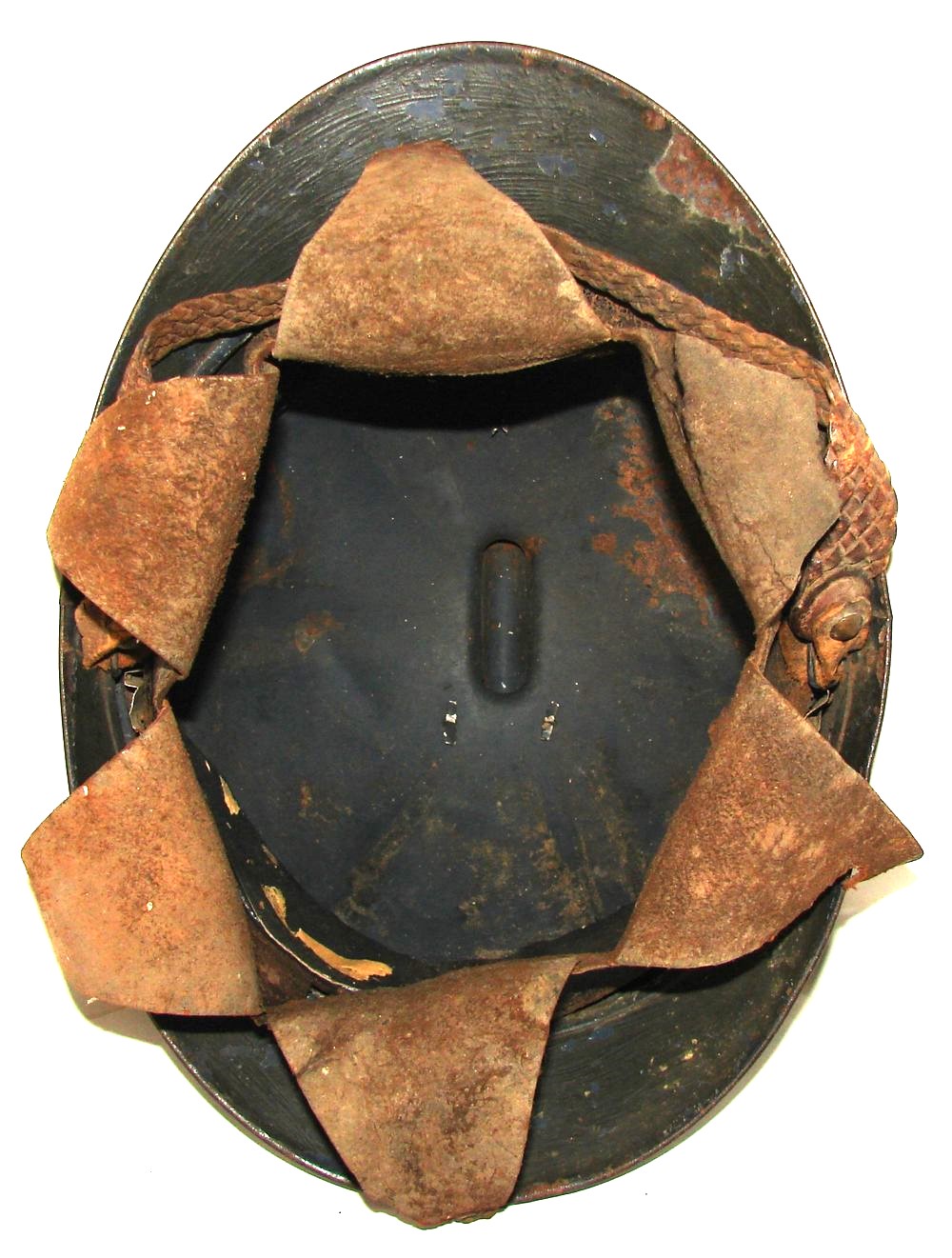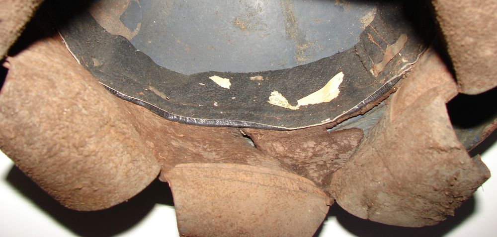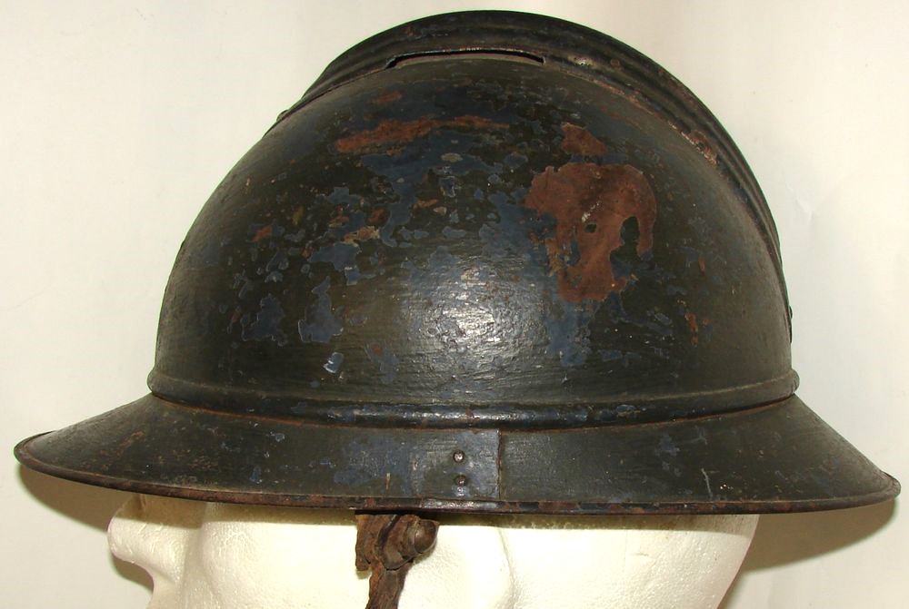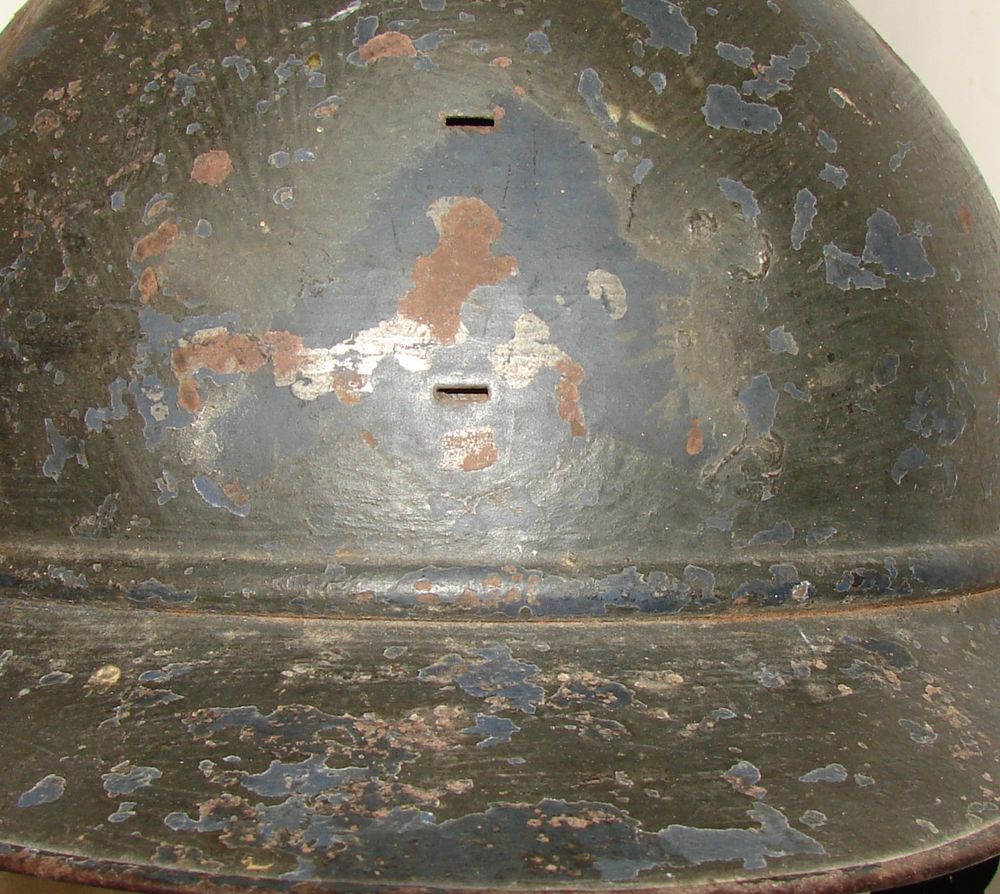 Casque M15 repeint en couleur kaki à la main. Coiffe du deuxième type, jugulaire tressée d'officier. Trace d'un insigne. Une étiquette se trouve sur le côté droit du casque, sur laquelle est inscrit " Artillerie n° 3673, 5/9/39 MARTINE" Taille 58.