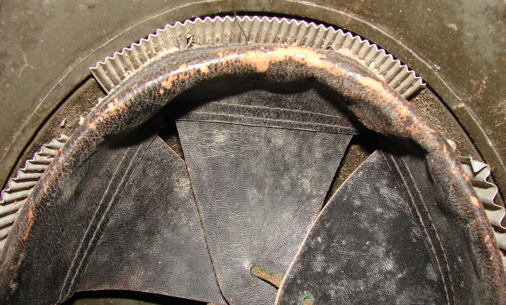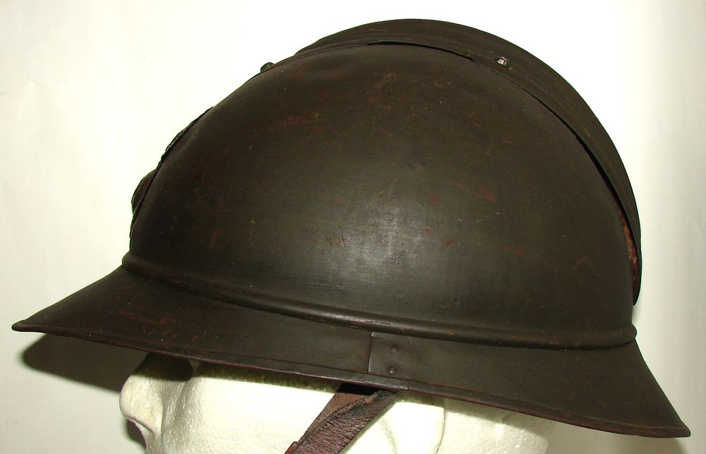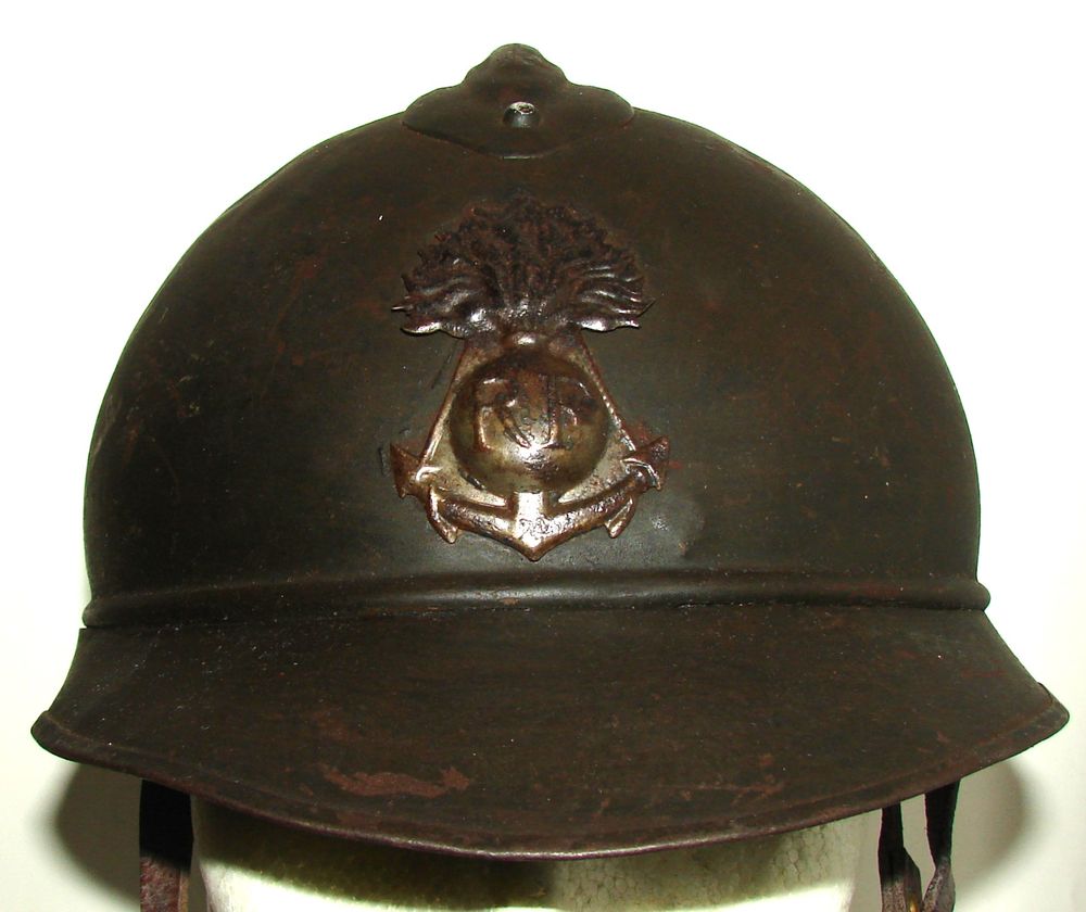 Casque colonial M15 de couleur gris fer mat. Intérieur cuir noir du deuxième type. Insigne des troupes coloniales, jugulaire en cuir marron. Manque un rivet à l'arrière du cimier.