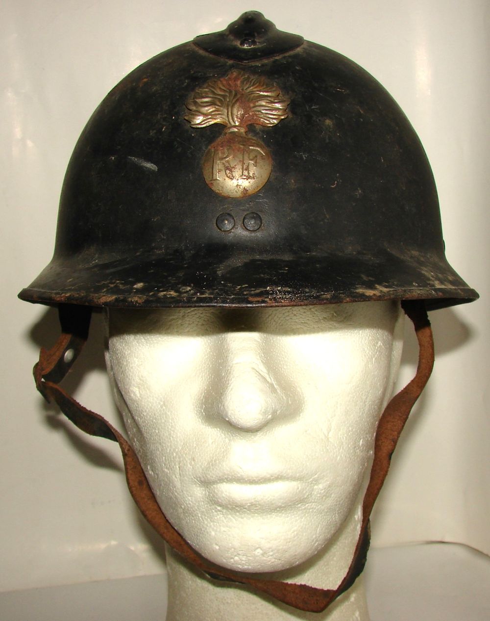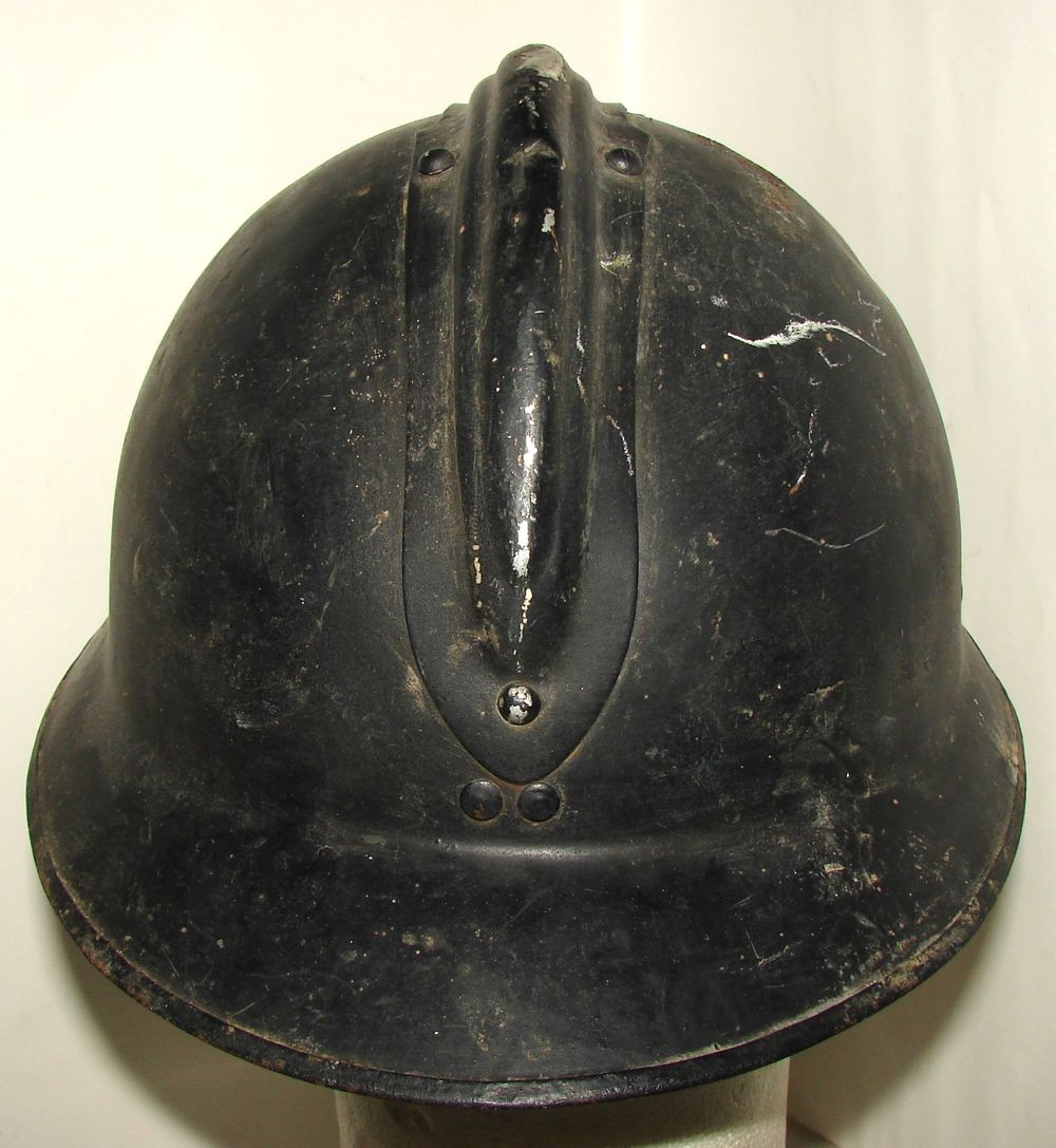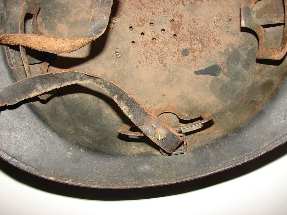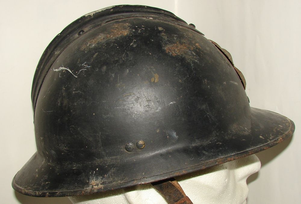 Casque M26 de la gendarmerie départementale de couleur bleu nuit, insigne fin des années 30, coiffe en cuir noir du deuxième type. Présence de la jugulaire.