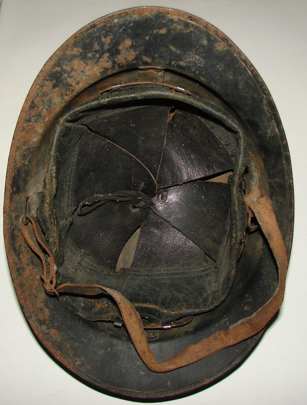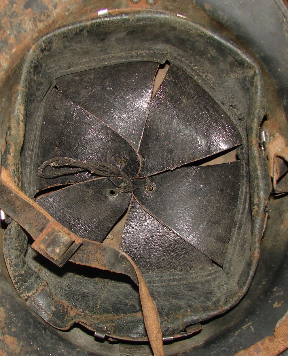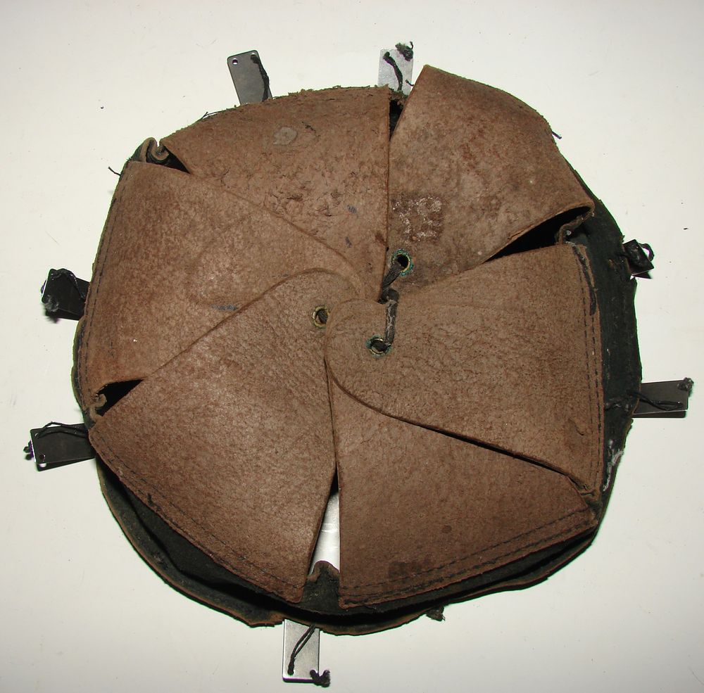 Casque M26 de la gendarmerie départementale de couleur bleu nuit, insigne fin des années 30, coiffe en cuir noir du deuxième type. Présence de la jugulaire.