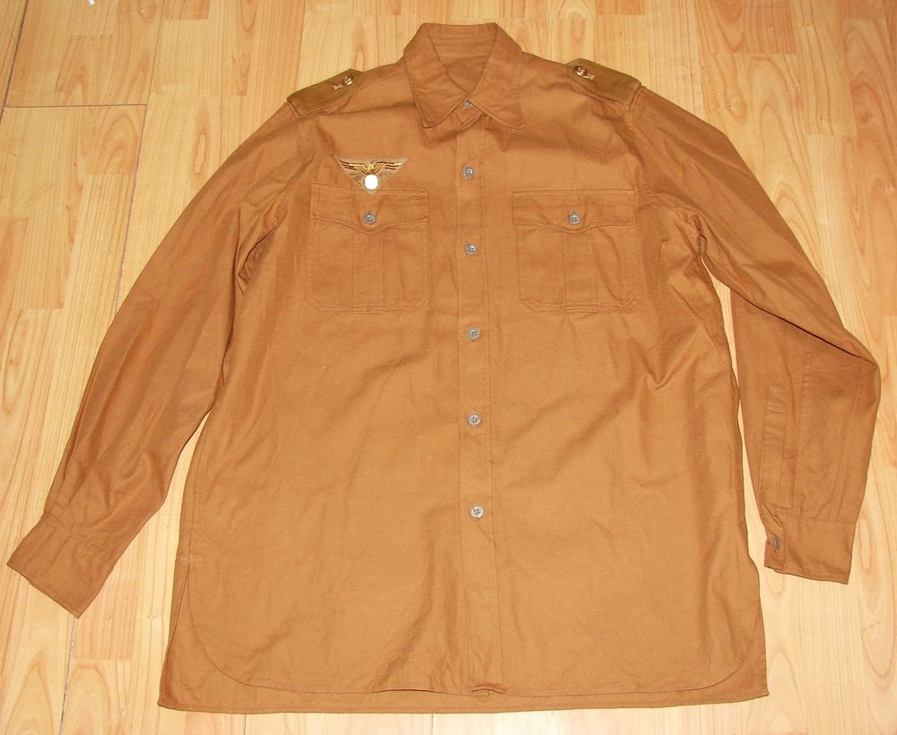 Chemise tropicale manche longue en coton, aigle de poitrine cousu machine en fil de coton jaune, taille 42. Boutons cuvettes. Aucun autre marquage.