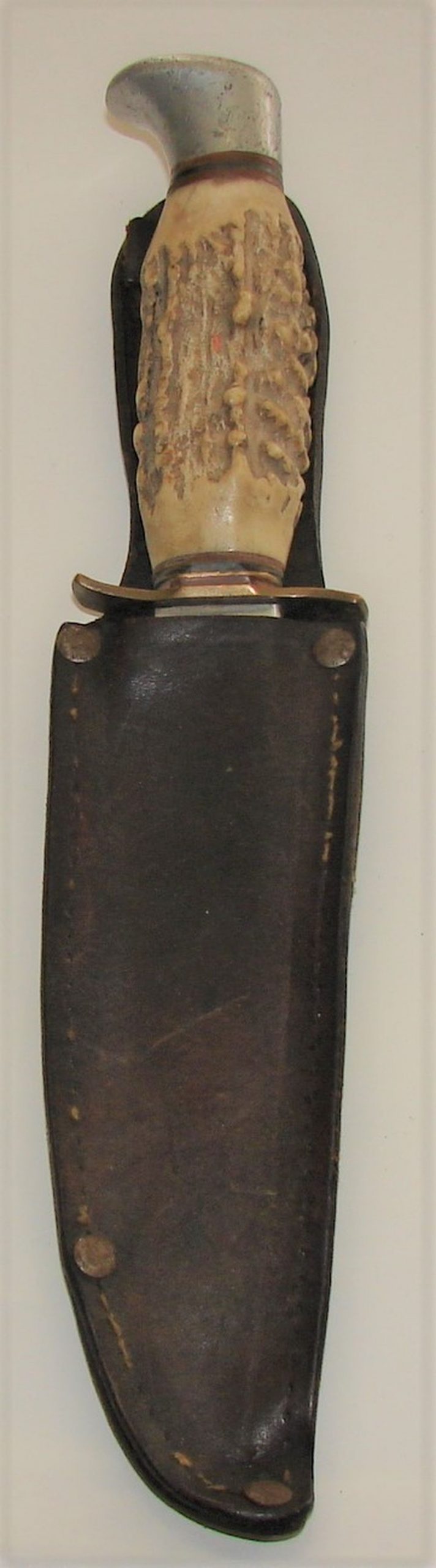 Couteau de fabrication Sabatier avec la couronne et le poignard gravé sur la lame ainsi que "Inoxydable et modèle déposée". Manche en corne dont les protubérances ont marquées le cuir. Attache cassée.