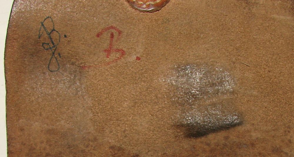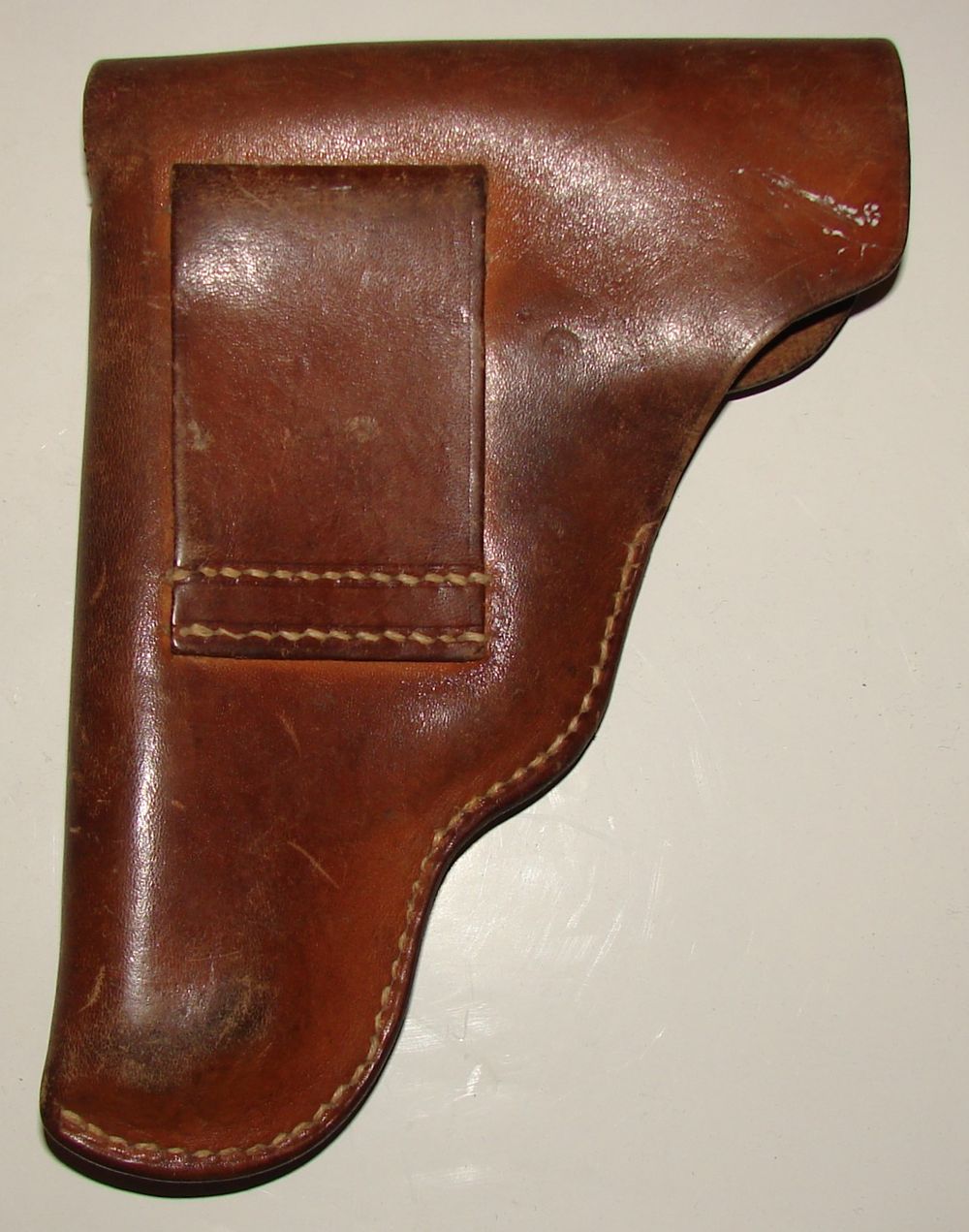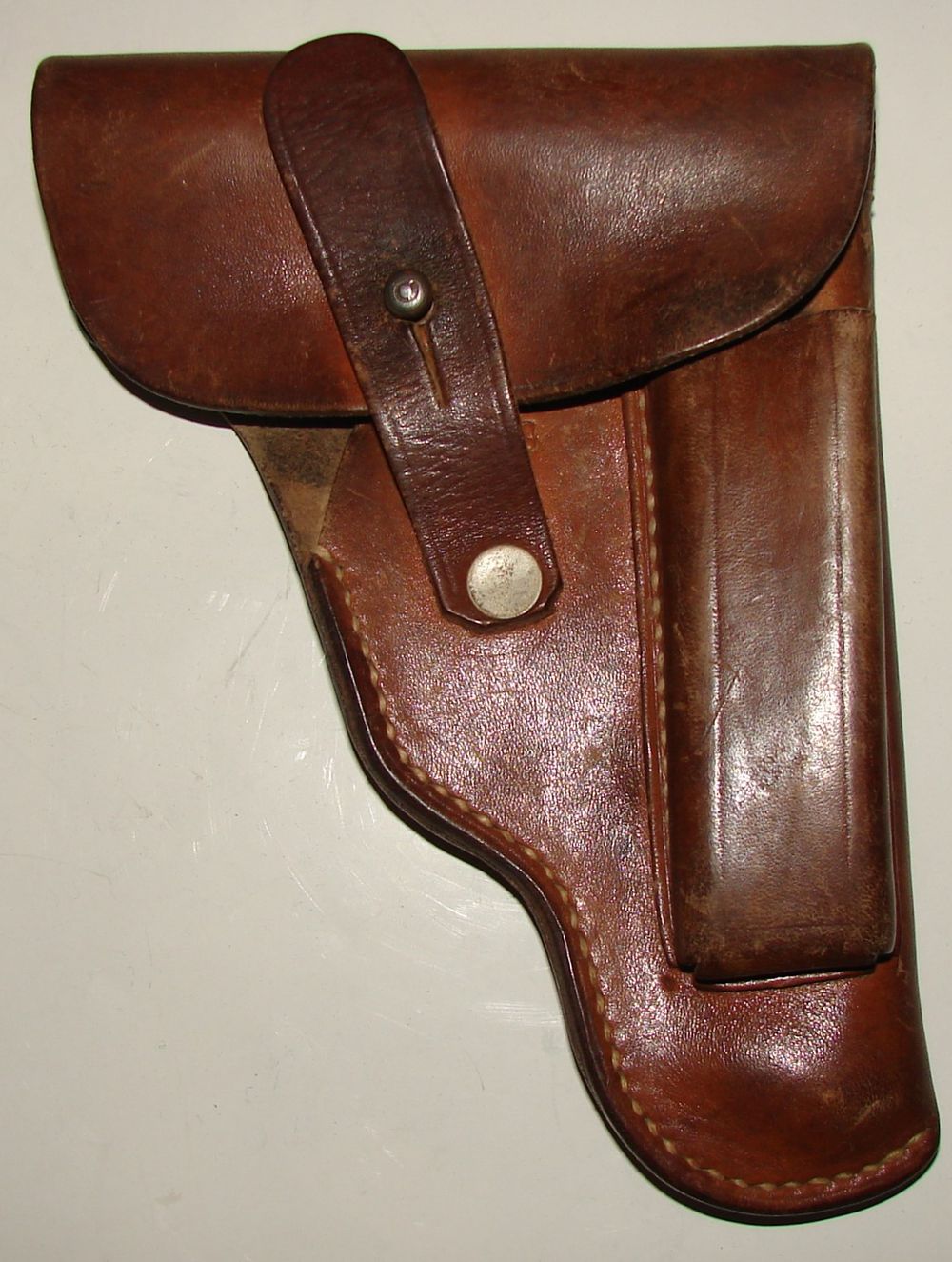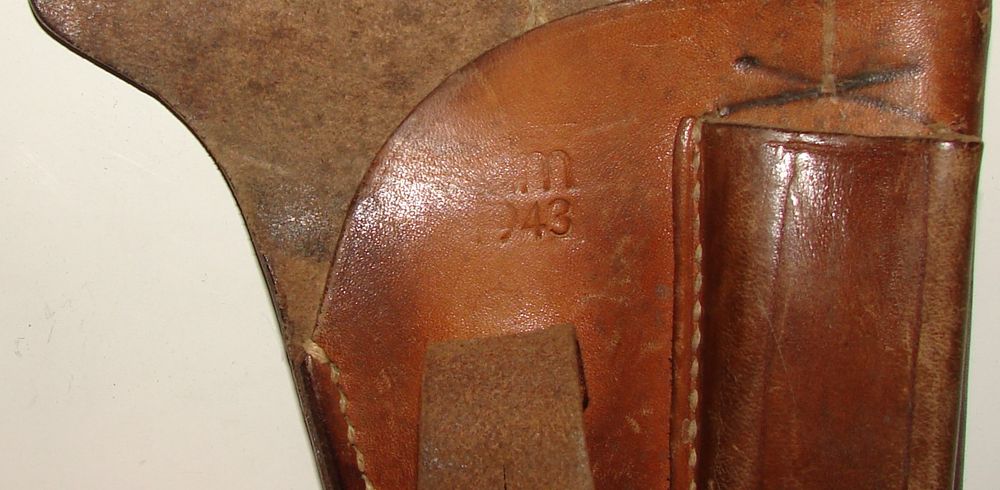 Etui pistolet en cuir marron pour CZ 27, "Česká zbrojovka, Armurerie tchèque" fabriqué par ? m, daté 1943. Initiale du propriétaire.