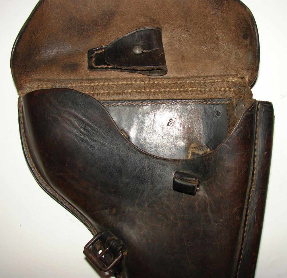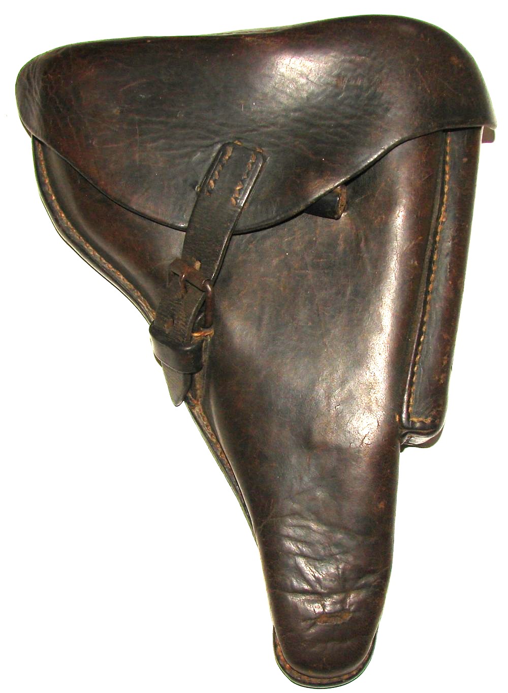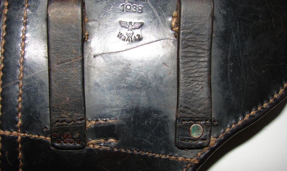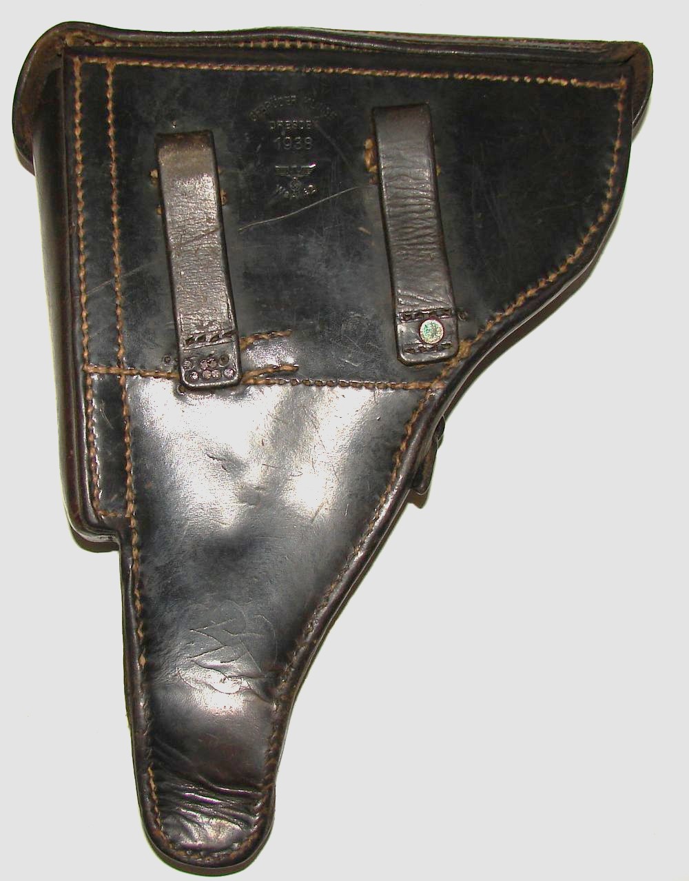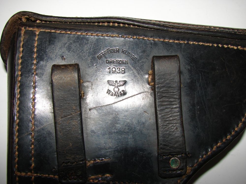 Etui de P08 en cuir noir, fabriqué par "GEBRÜDER KLINGE DRESDEN" daté de 1939. Aigle du WaffenAmt 142. Réparation d'époque sur le bas des passants en cuir.