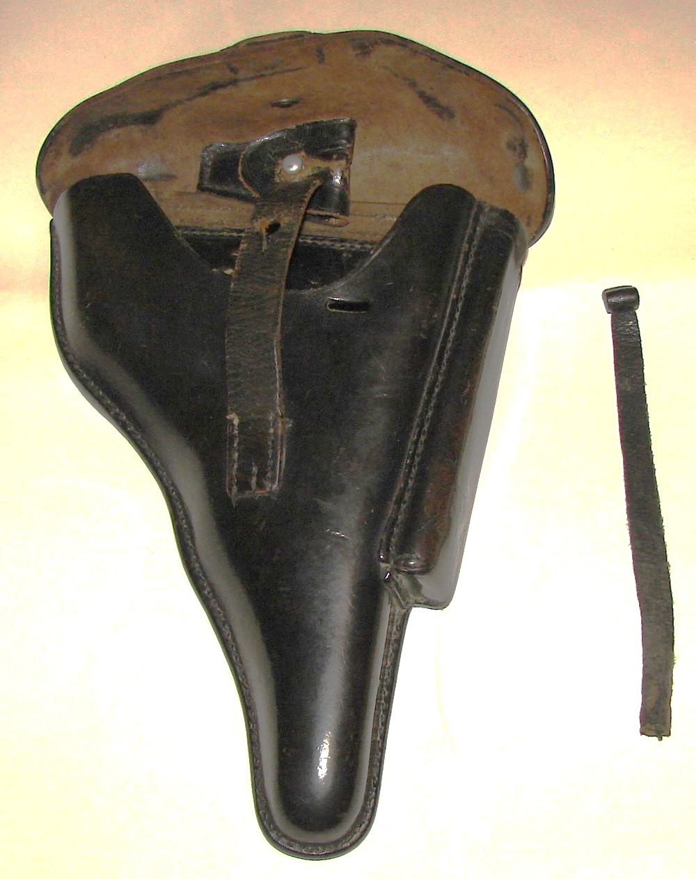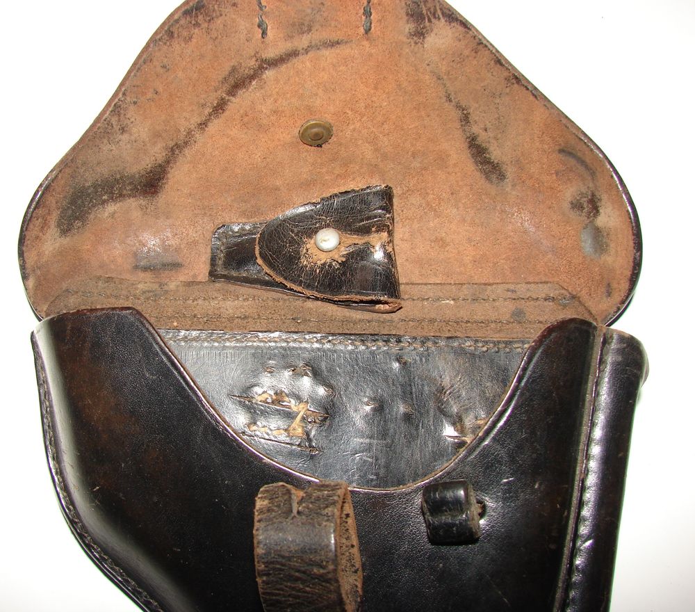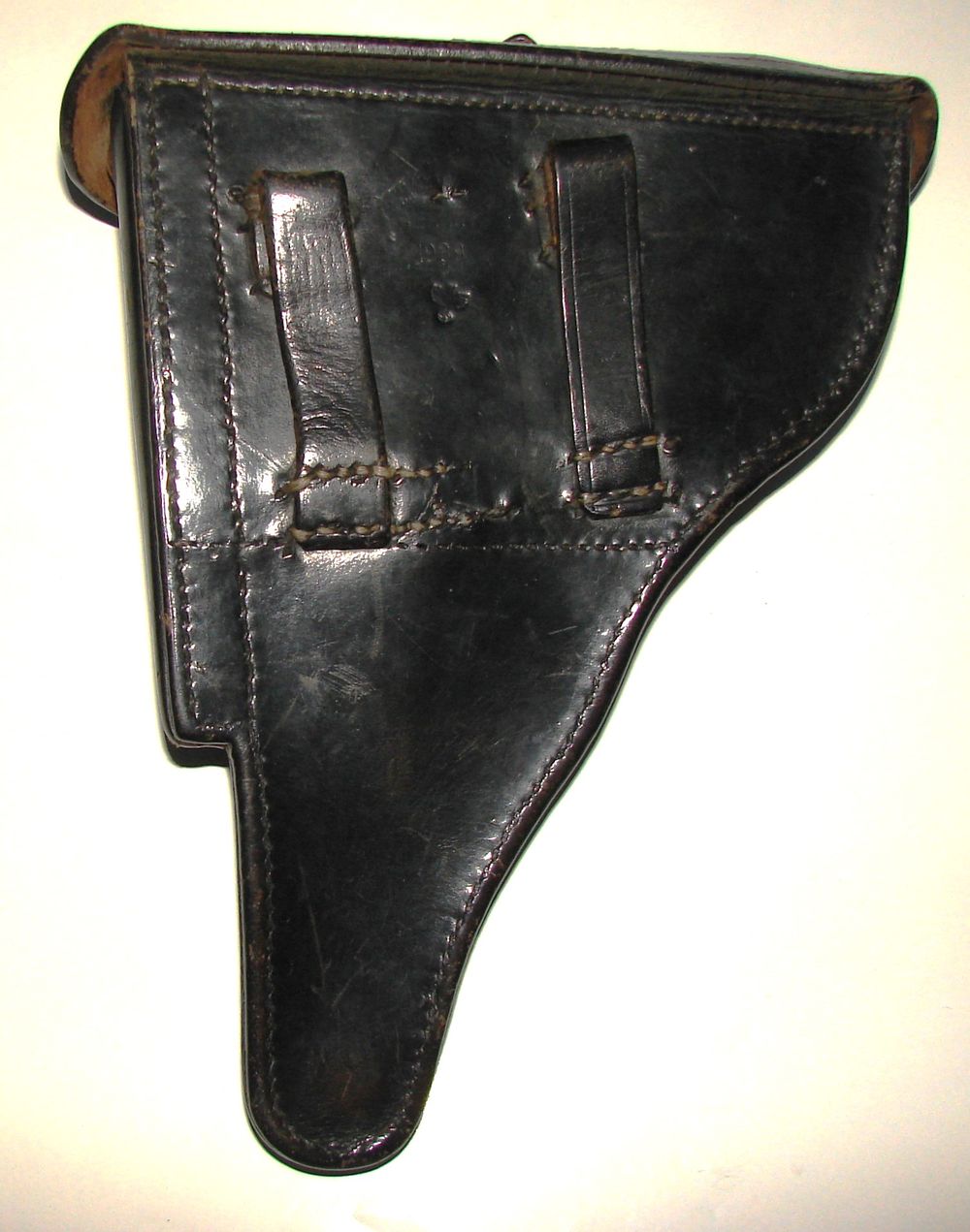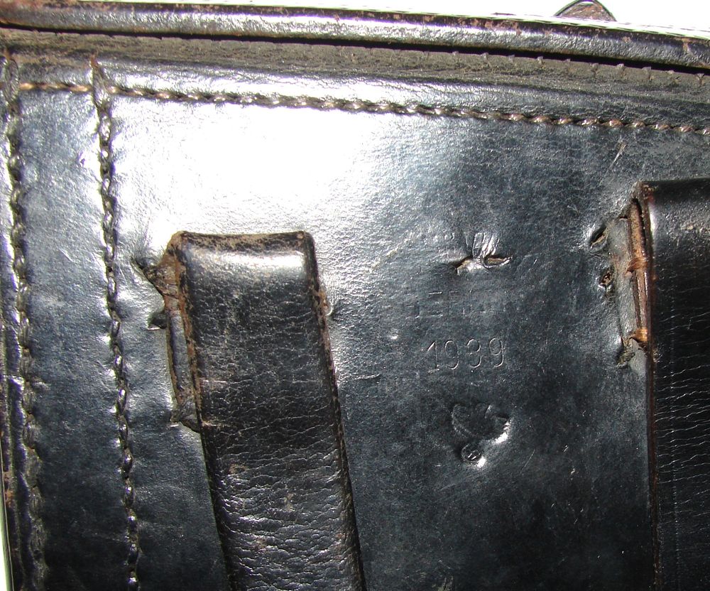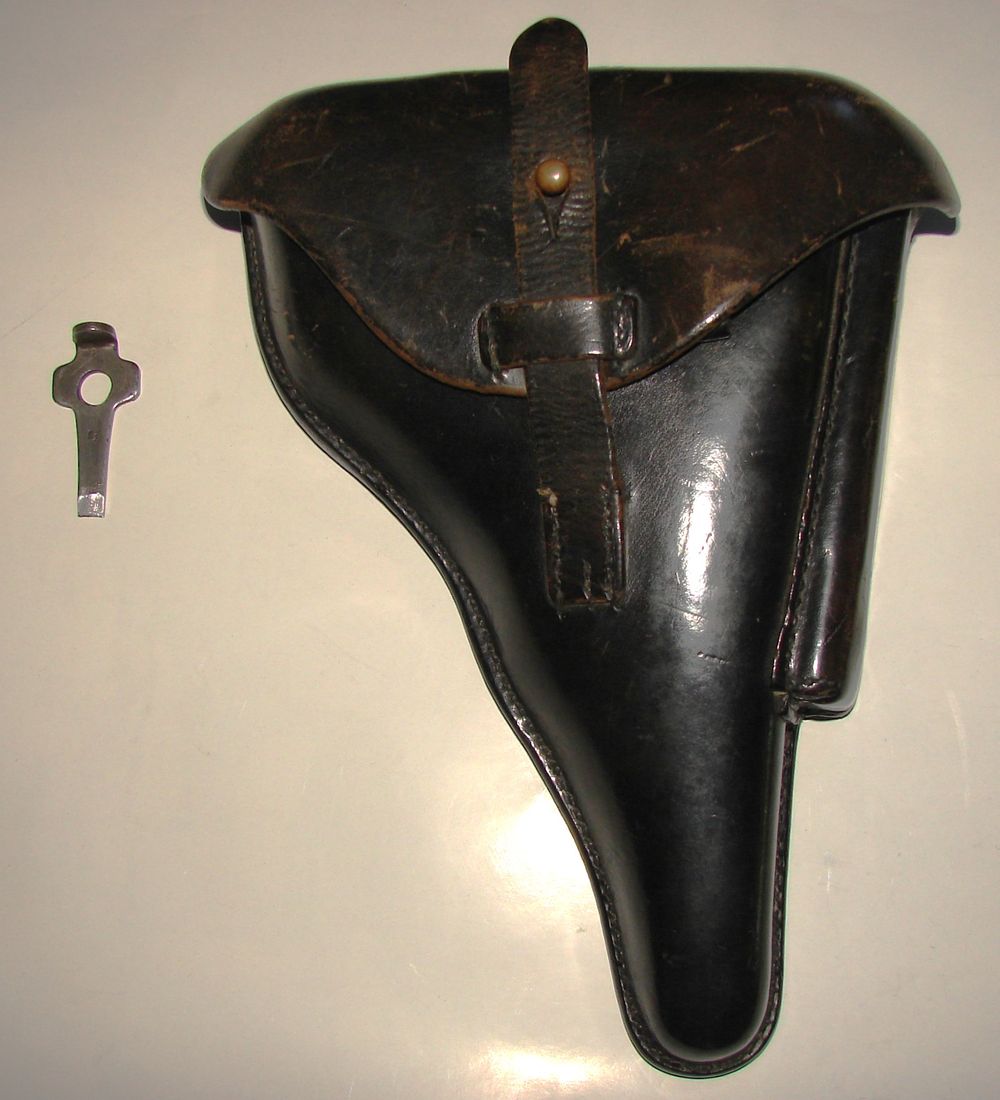 Etui de P08 avec outil, en cuir noir fabriqué par "Illisible, Berlin 1939" Aigle du waffenAmt. Outil tamponné du WaffenAmt également. La languette pour sortir le pistolet est décousue.