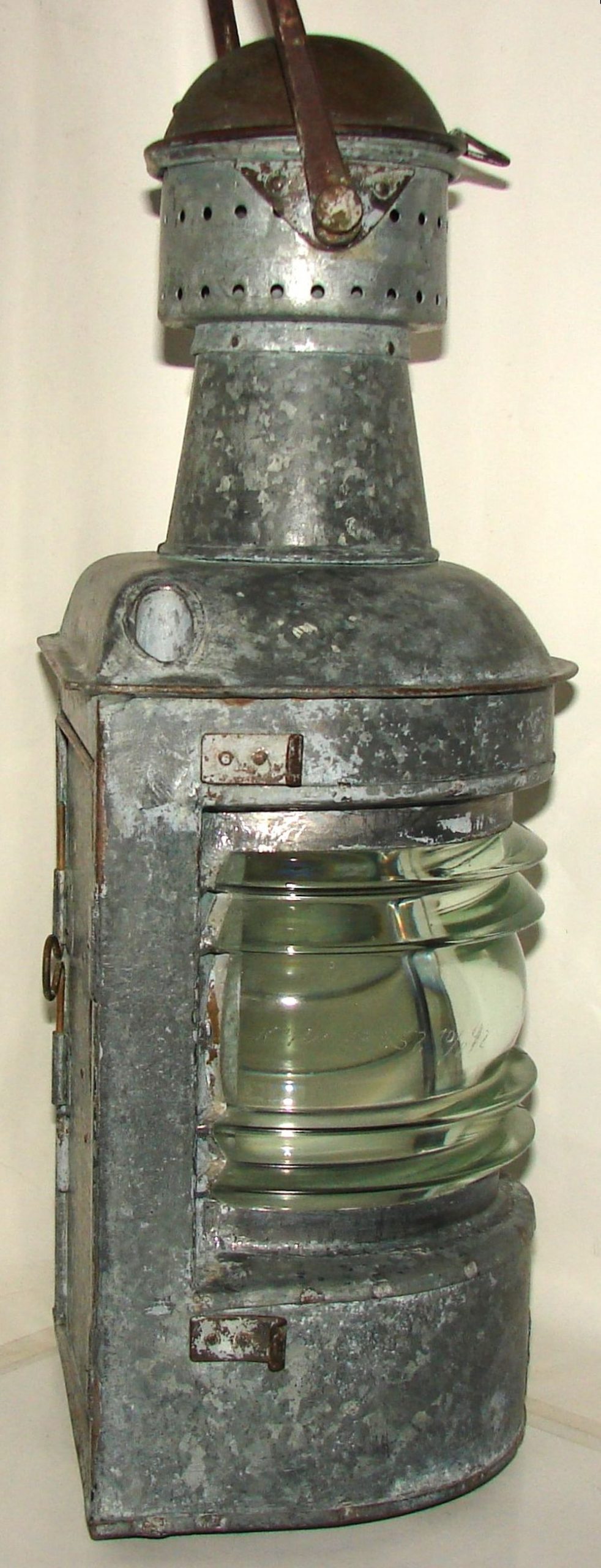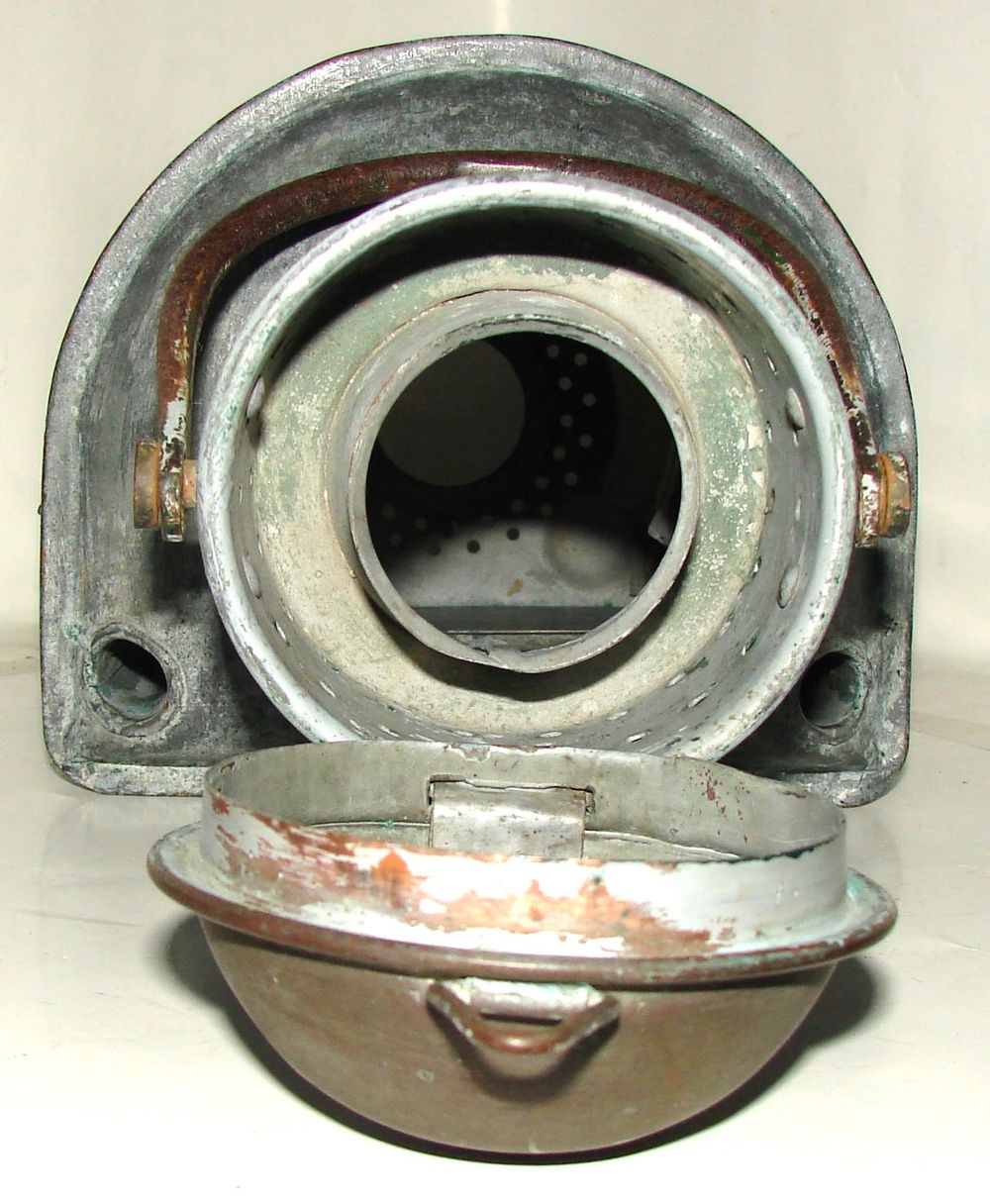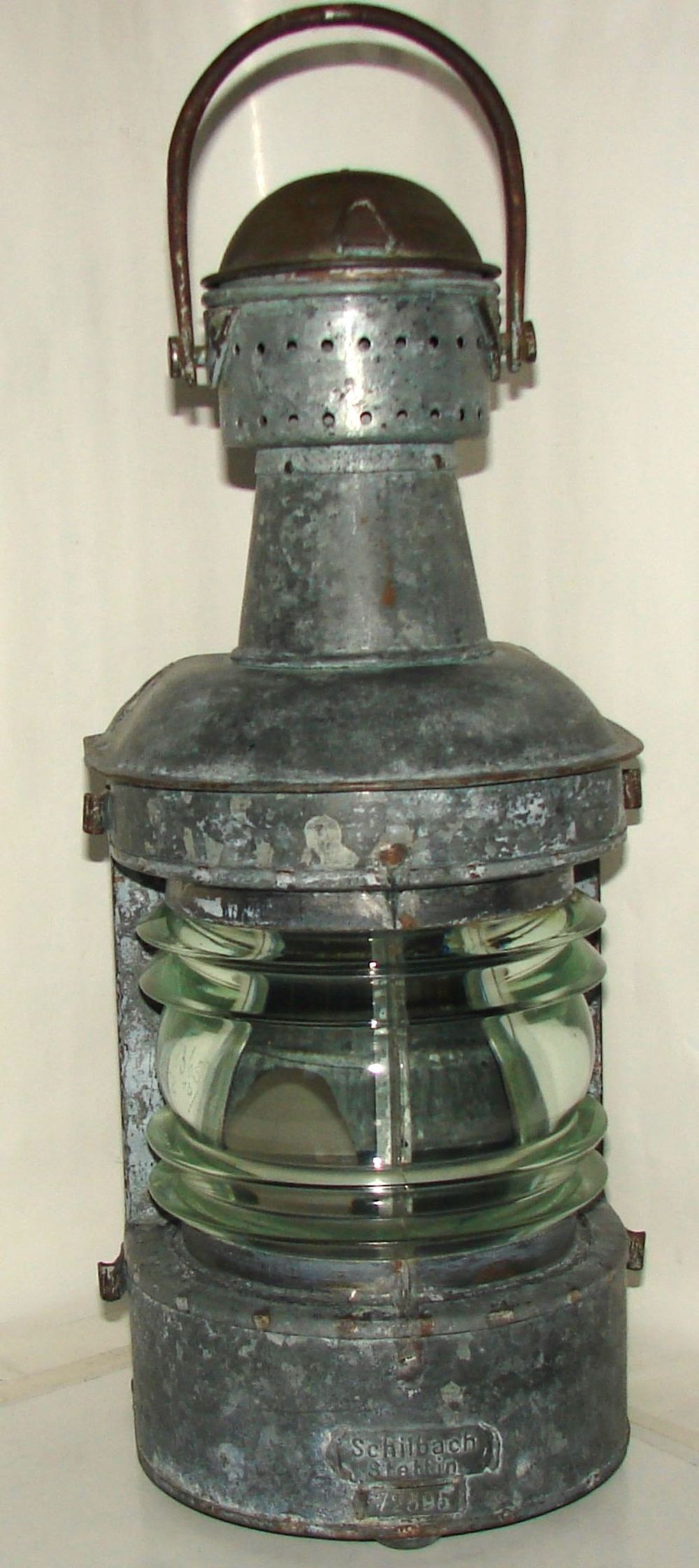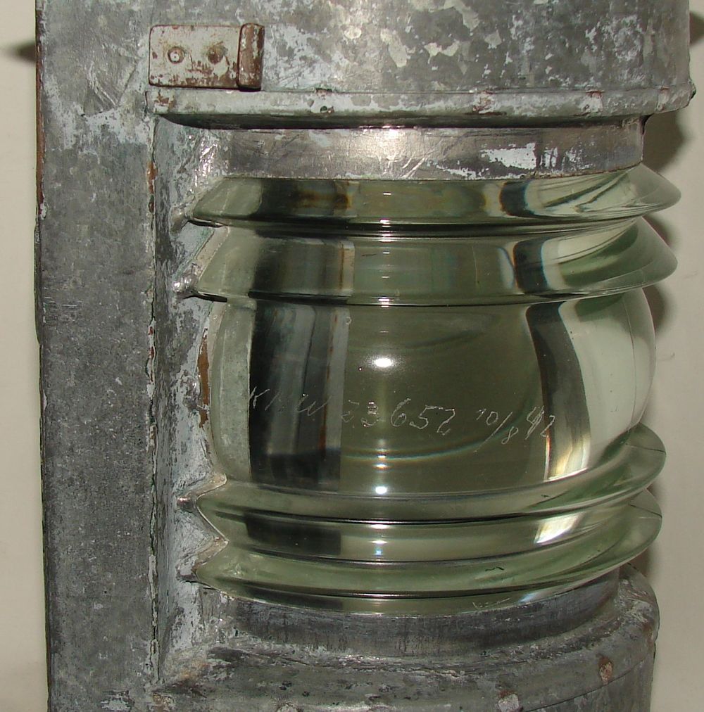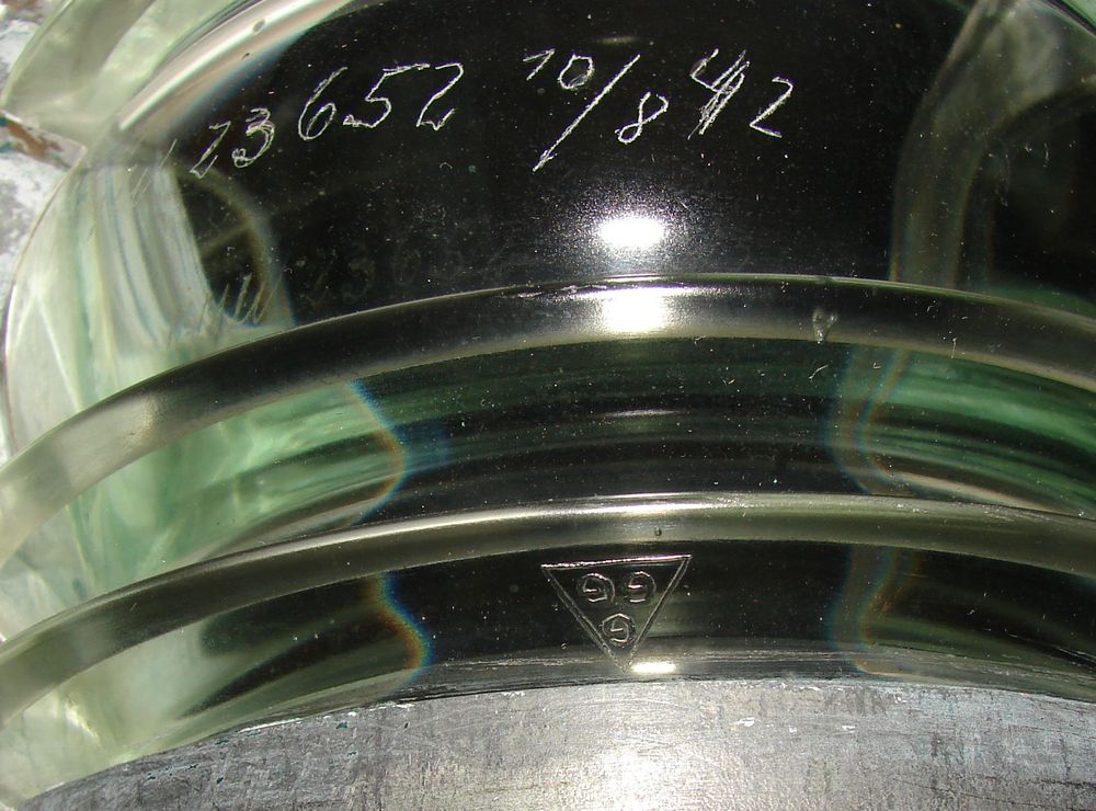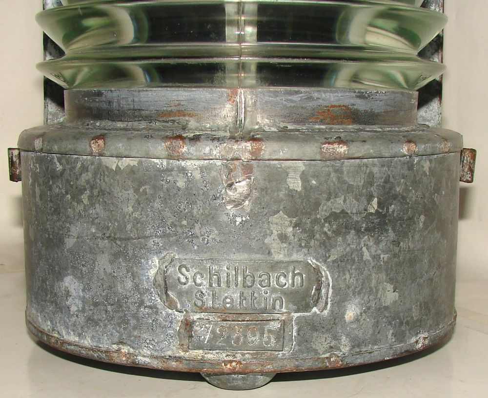 Fanal de la kriegsmarine fabriqué par la firme "Schilbach" à Stettin. Nr de série; 72395. Verre gravé: KMW, KriegsMarineWerke, Nr 23652, fait le 10/8/1942. Tampon du "M" de Marine et la croix gammée. Deux triangles avec 3 "G" sont de part et d'autre du globe en verre.