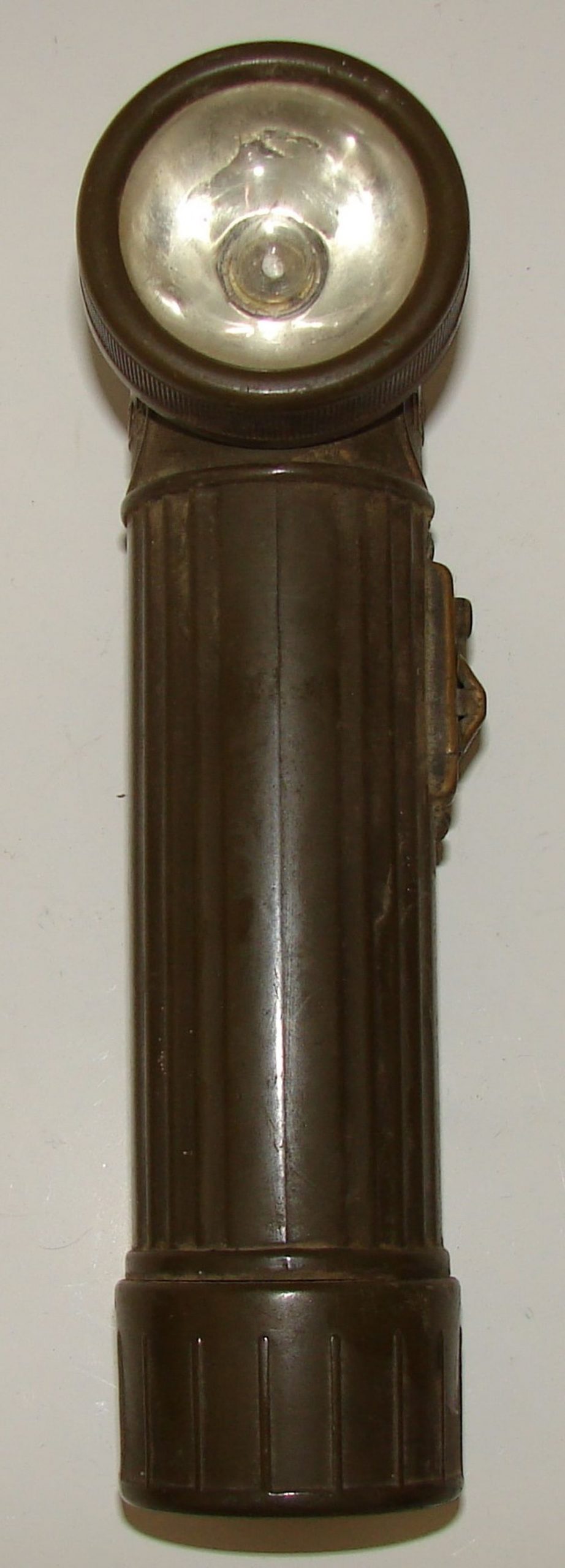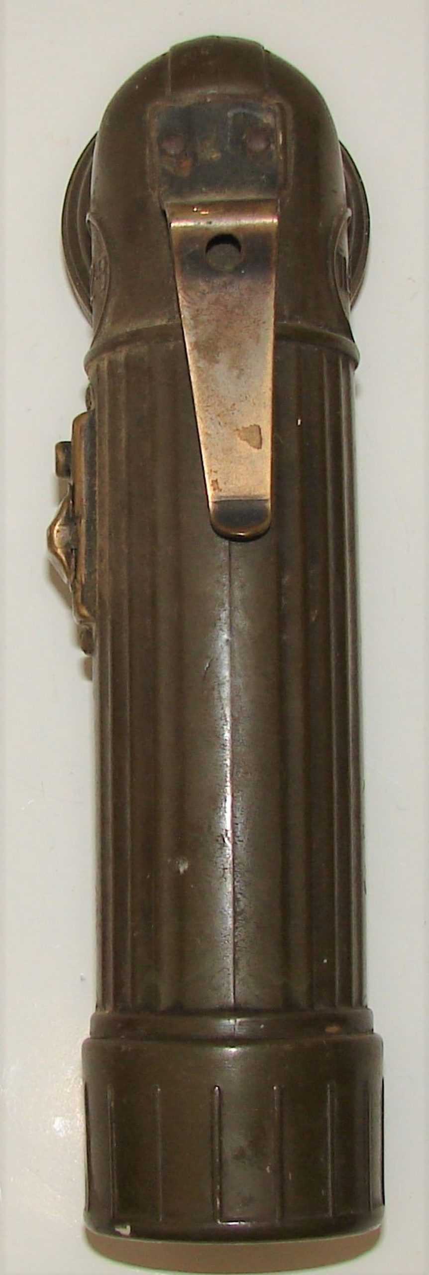 Lampe électrique TL 122 B de l'US Army en plastique vert, sans les filtres de différentes couleurs. L'ampoule de rechange est en place. Le bouton poussoir fonctionne. Bouchon marqué: " USA LITE, united states electric MFG corp. NEW YORK." Initiales "MB" gravées sur le bouchon.
