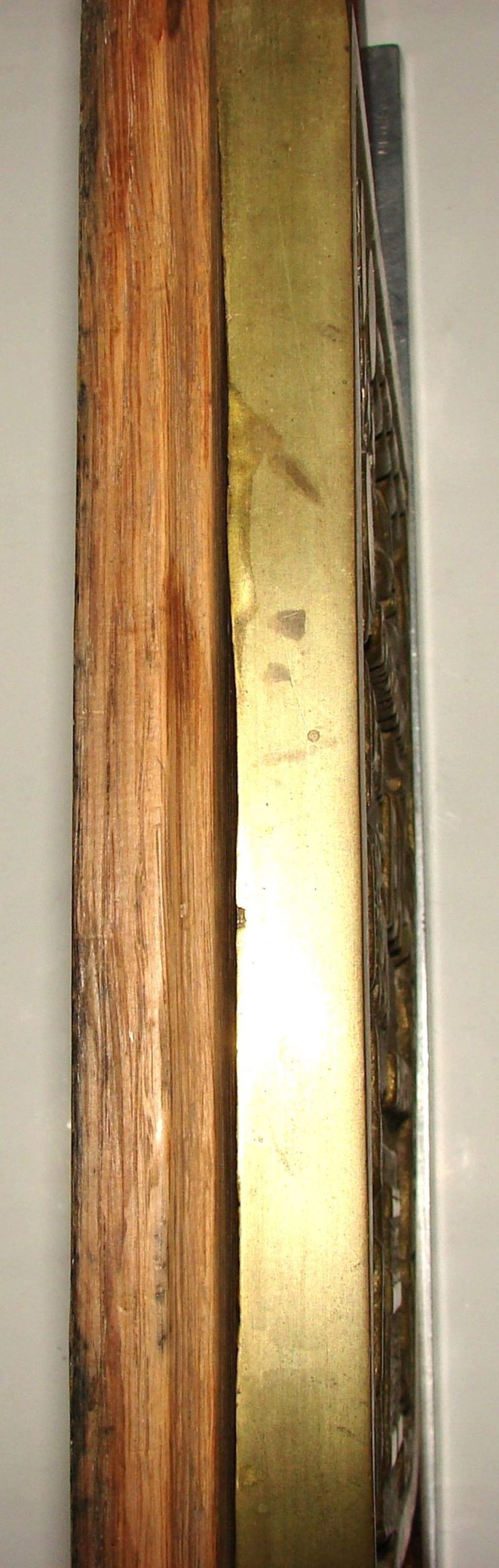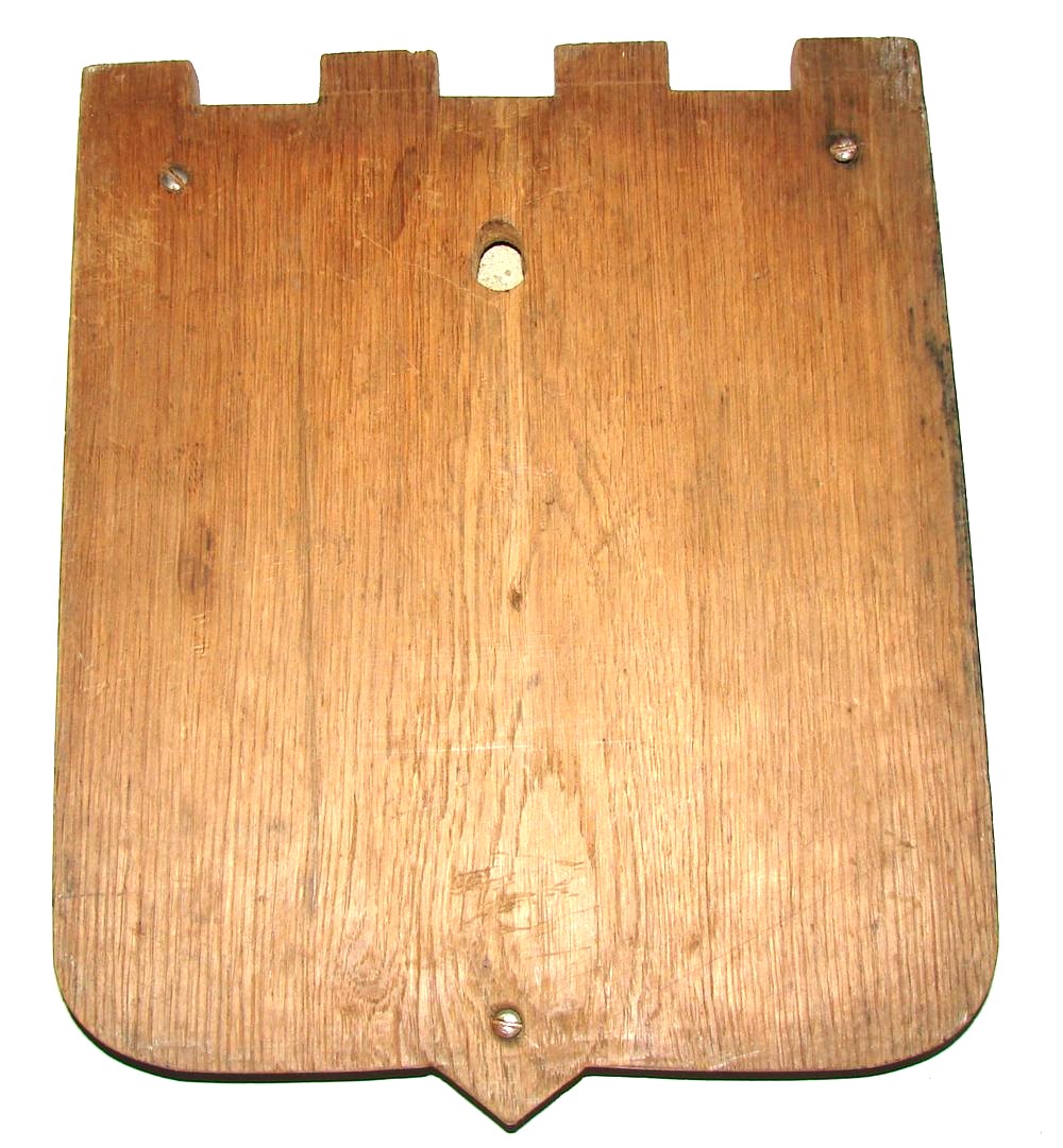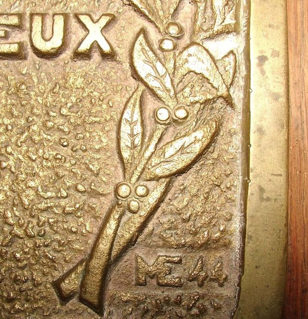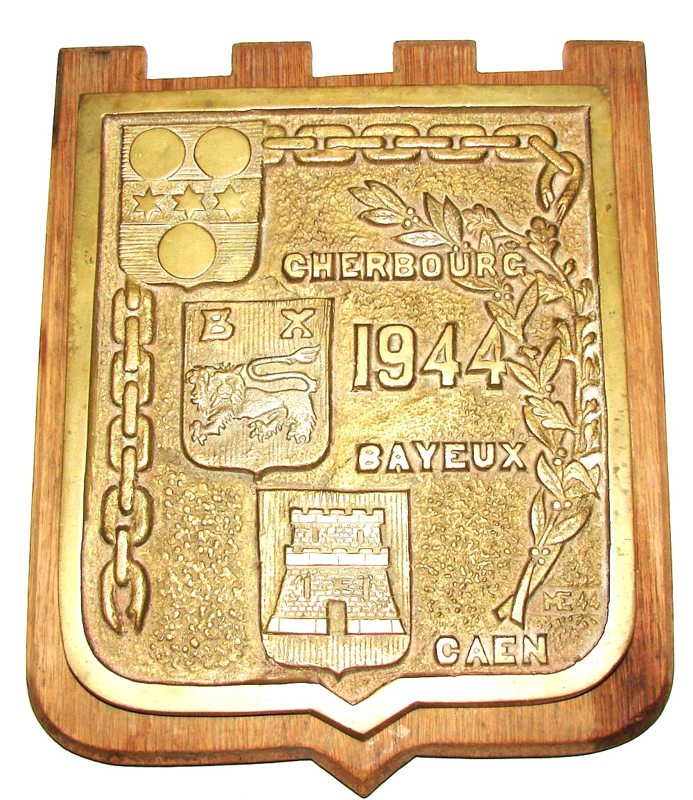 Plaque en fonte moulée sur un support en bois à l'effigie des villes de Cherbourg, Bayeux, Caen, réalisé par le sculpteur "ME" et datée de 1944.