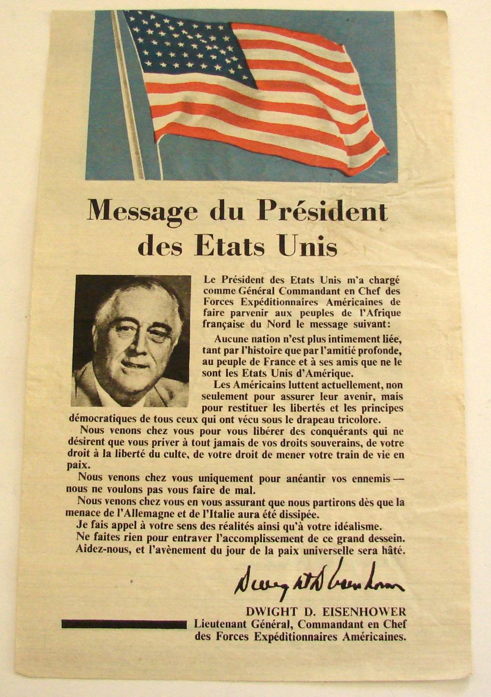 Tract du général Eisenhower relayant les propos du Président des Etats-Unis sur la conduite à tenir pour la population. Tract rédigé en Français et en Arabe.