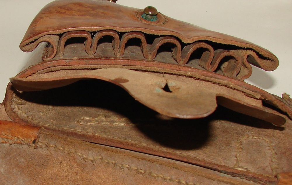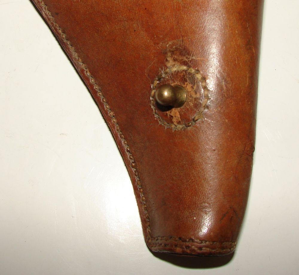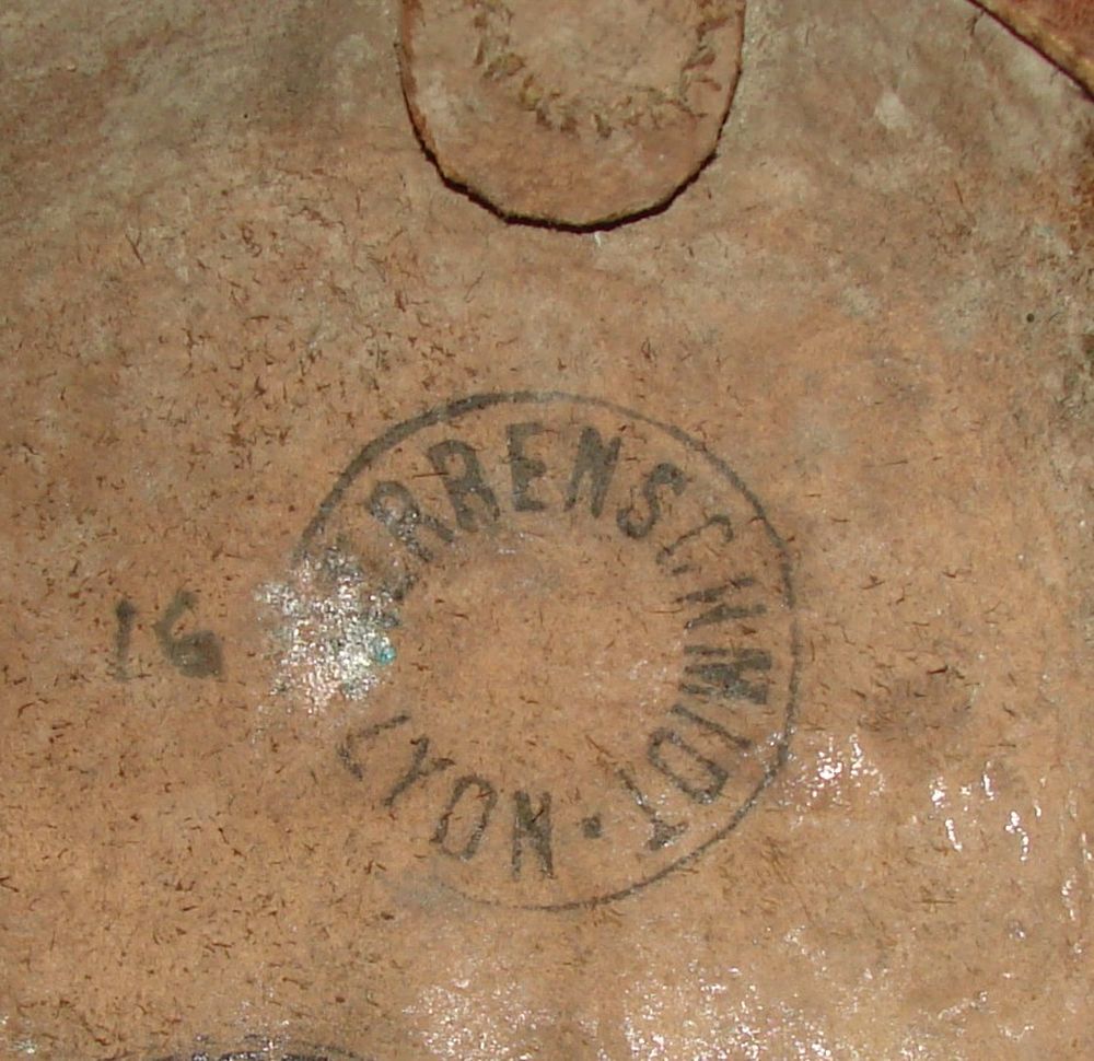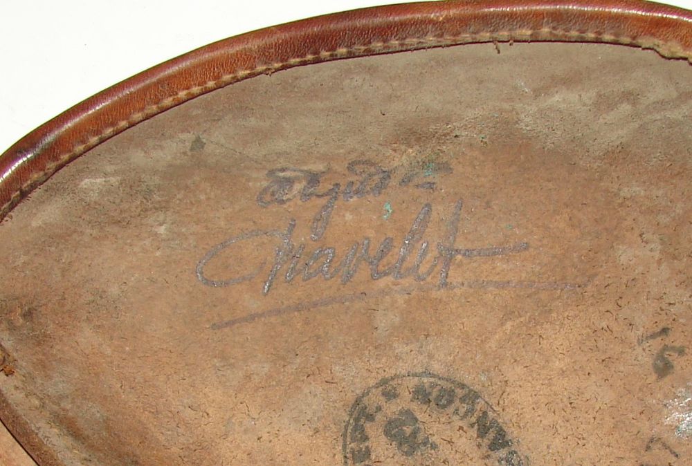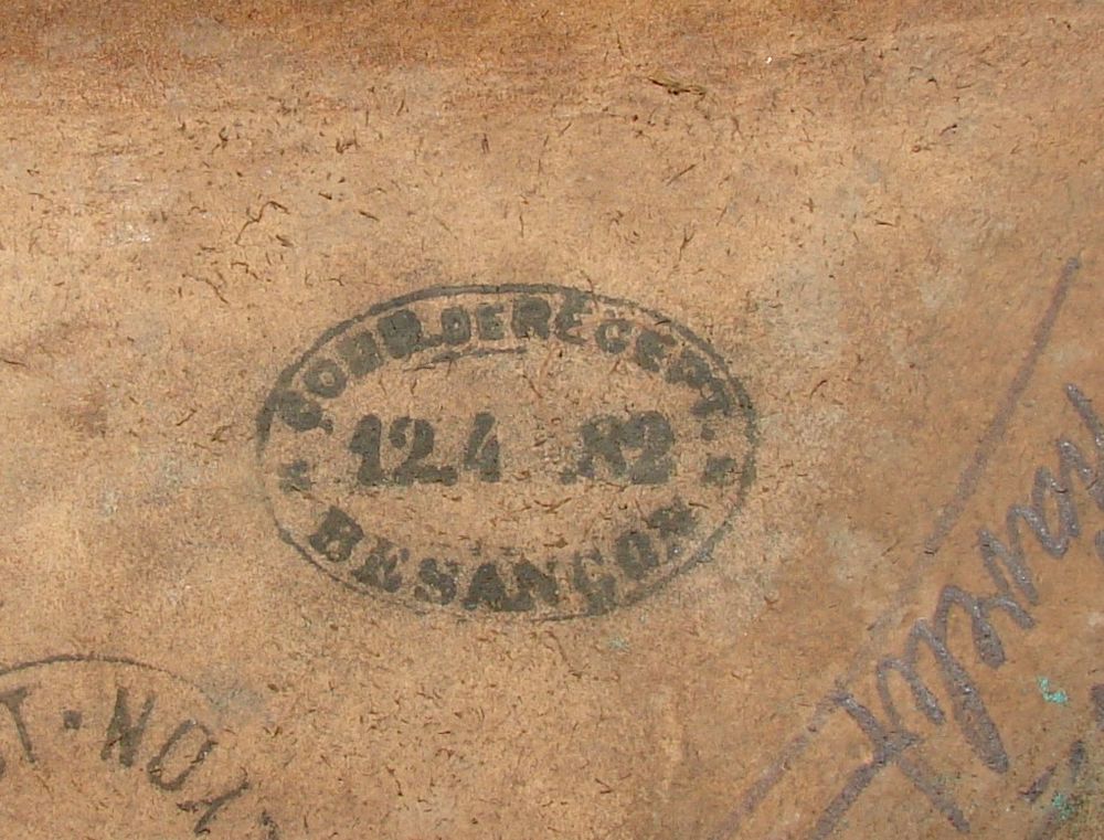 Brown leather case for a Mle 1873 revolver. Two stamps present, one from the manufacturer "...ERRENSCHMIDT LYON" and one from the reception commission of the Besançon garrison dated April 12, 1882, and name of the owner "Auguste (?) Chavelet"