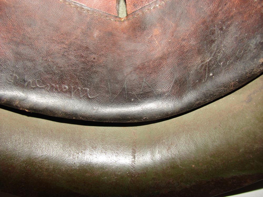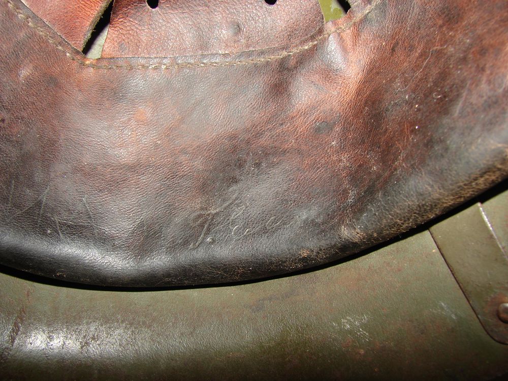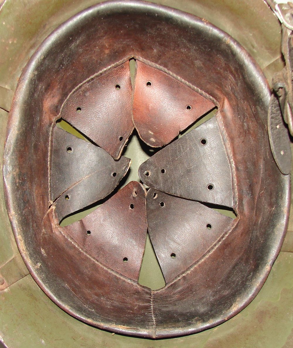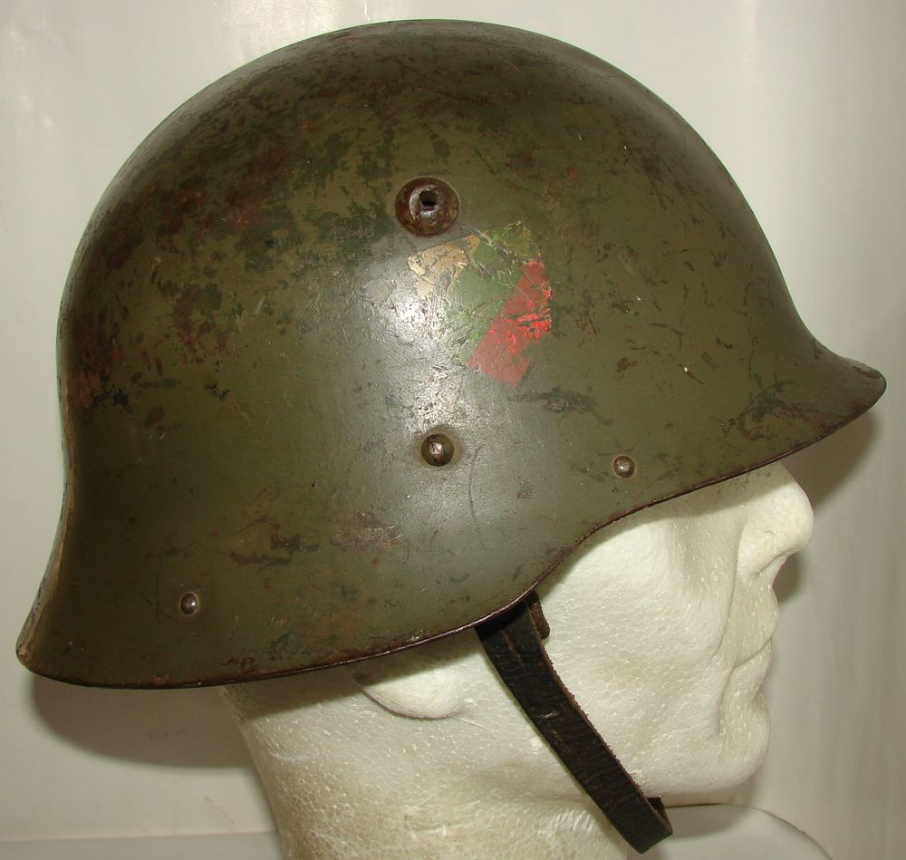 Bulgarian Army M36 C helmet in dark green, leather cap attached by 4 metal strips. Decal of the national colors bordered in black affixed before 1940. German type chinstrap with buckle painted green. Owner's name in Cyrillic, size 56.