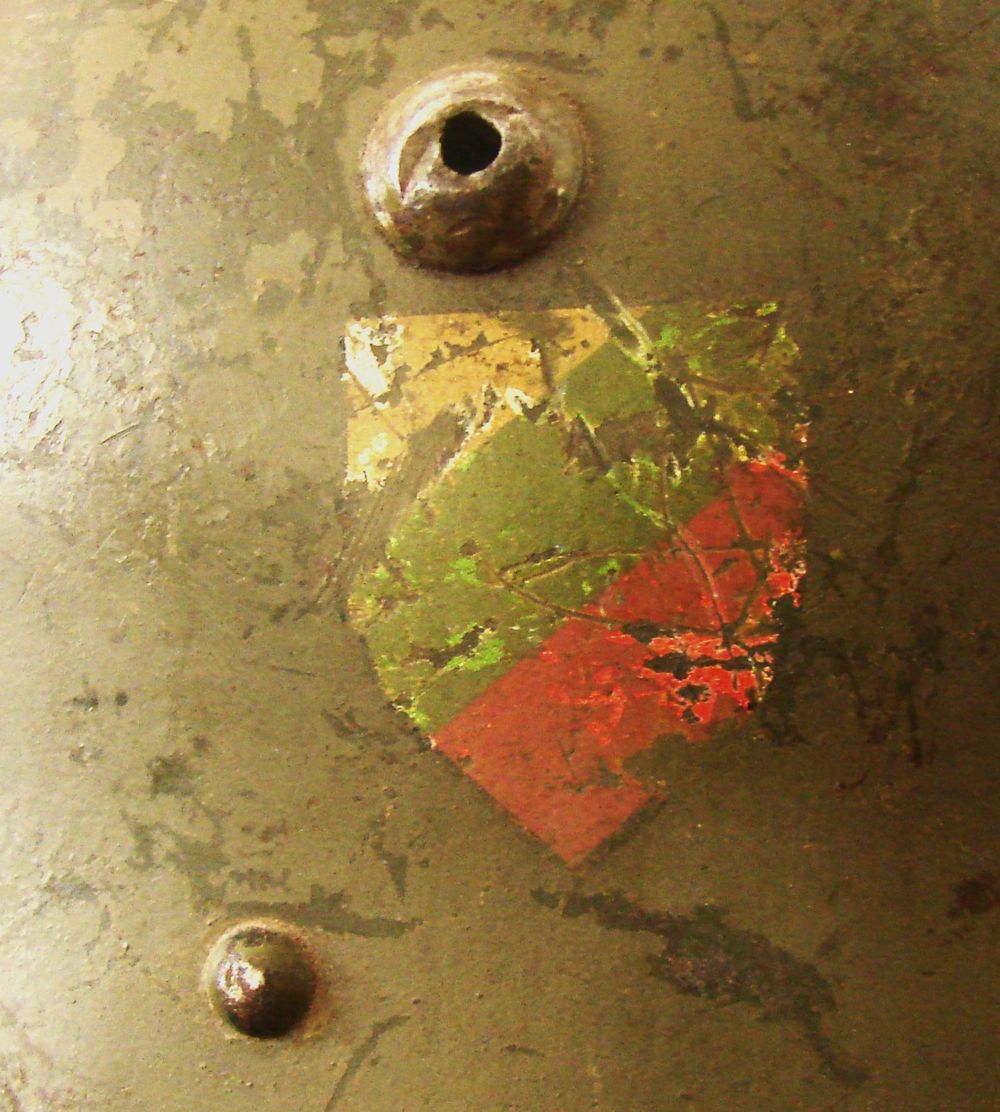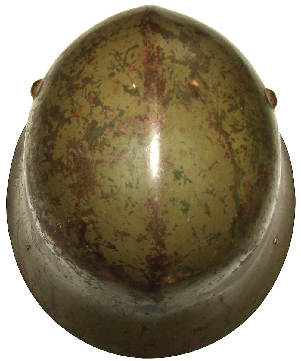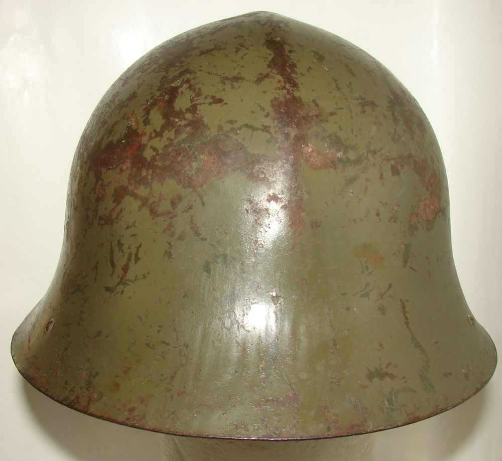 Bulgarian Army M36 C helmet in dark green, leather cap attached by 4 metal strips. Decal of the national colors bordered in black affixed before 1940. German type chinstrap with buckle painted green. Owner's name in Cyrillic, size 56.