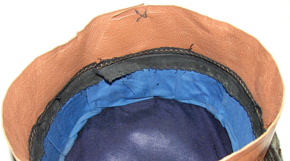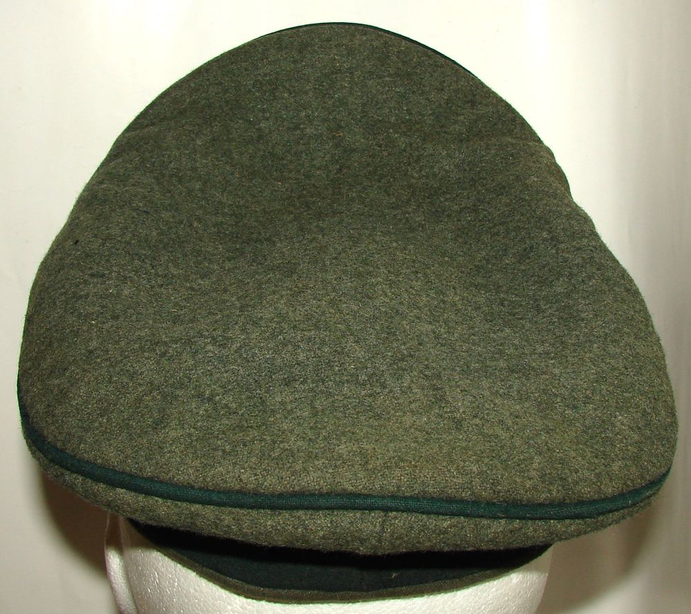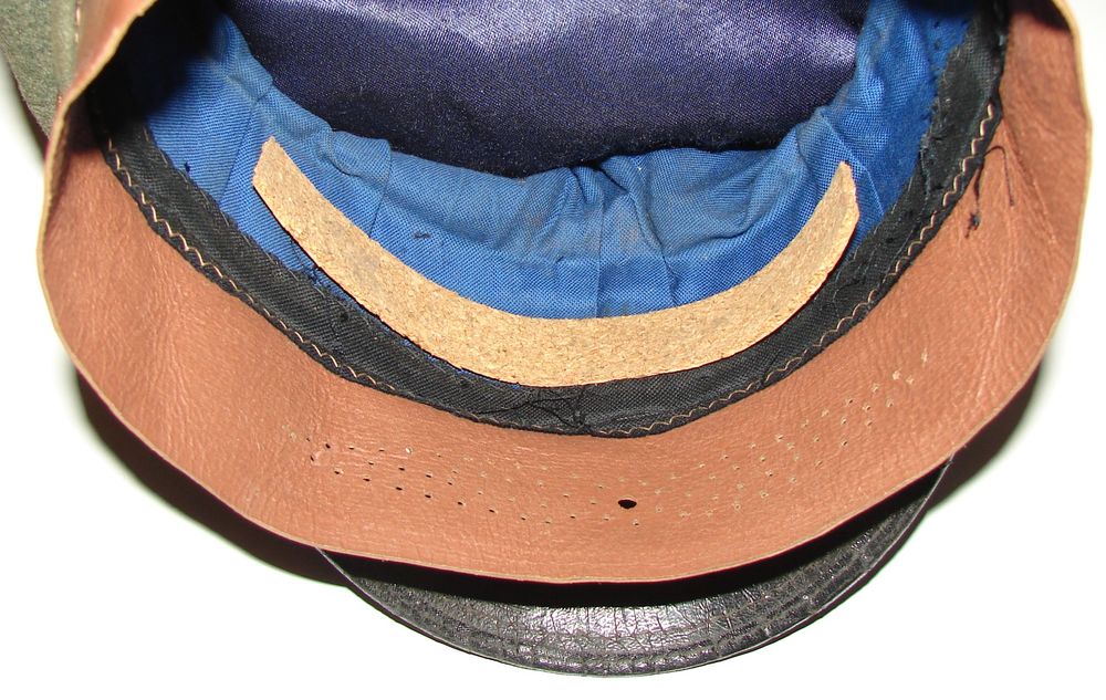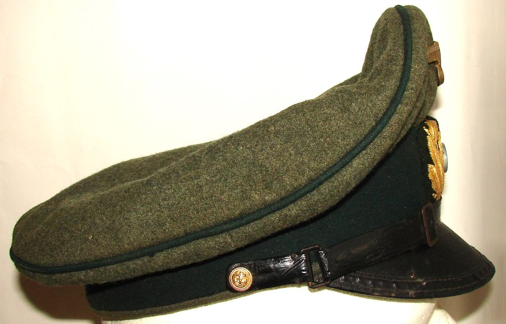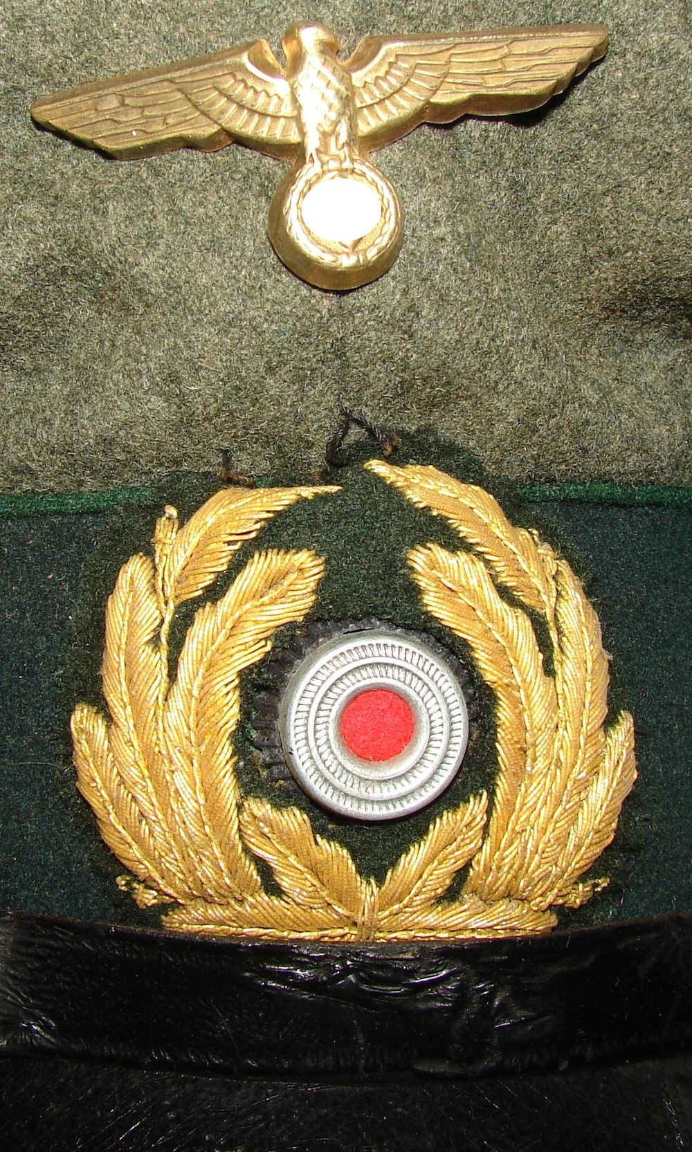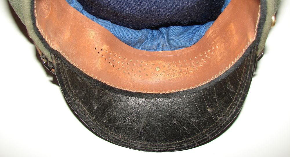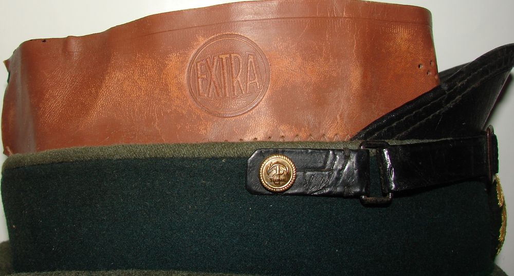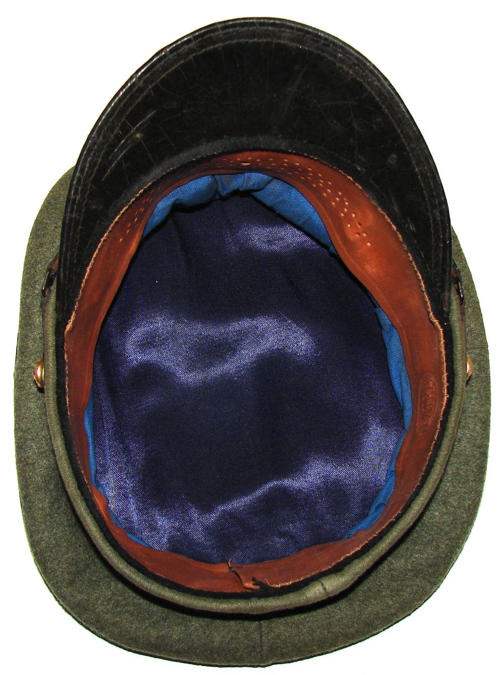 Cap in green wool cloth. Lining in dark blue silk and light blue cotton. Brown leather sweatband marked "EXTRA". Metal eagle and oak leaf in gold cotton thread. Boiled leather visor.