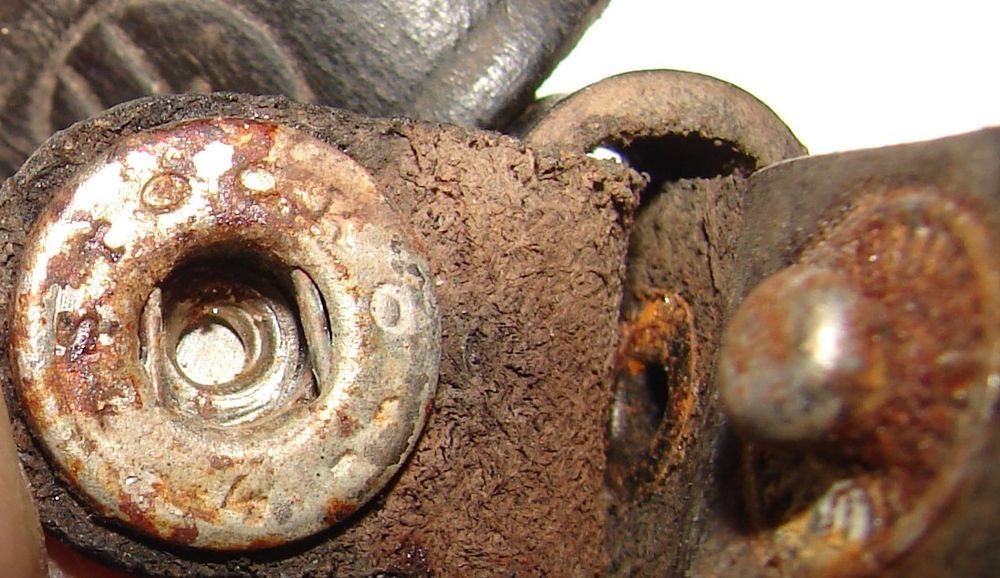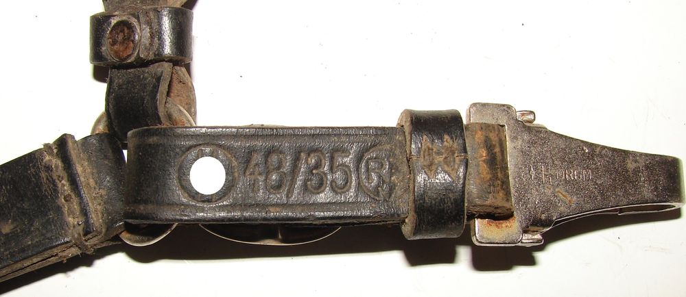 Three-part leather Allgemeine SS dagger clasp, marked "SS 48/35 RZM," with 48 being the manufacturer's code and 35 the year 1935. Metal hook marked with the Assmann logo and DRGM "Deutsches Reich GebrauchsMuster, German Reich Utility Model." Buttons marked "Stocko 4."