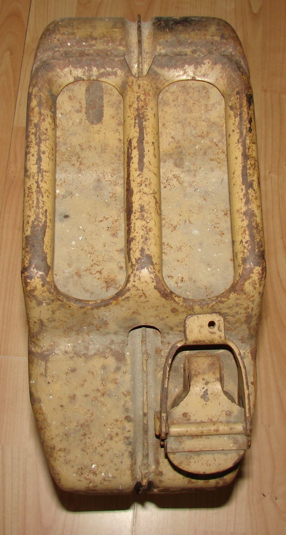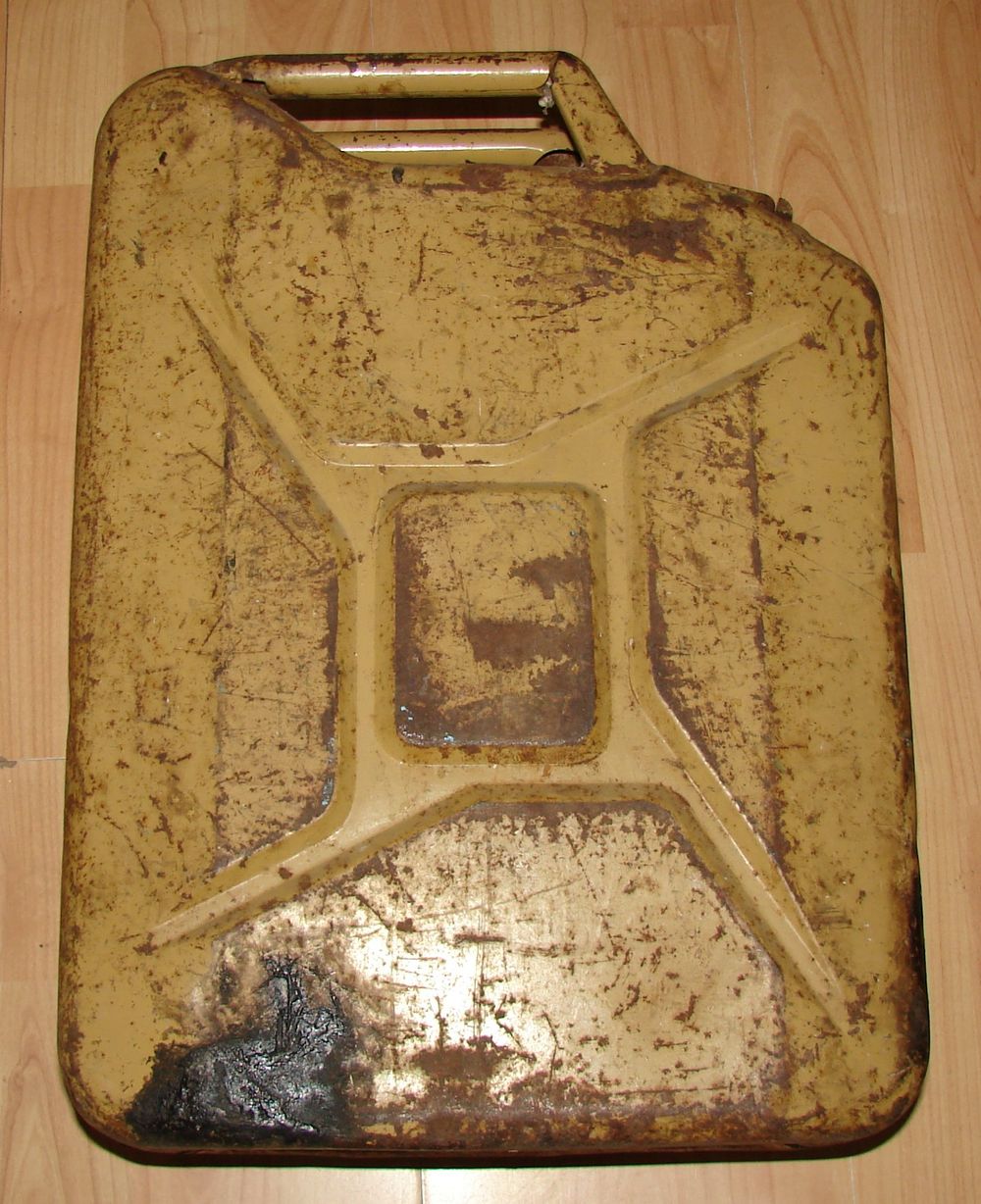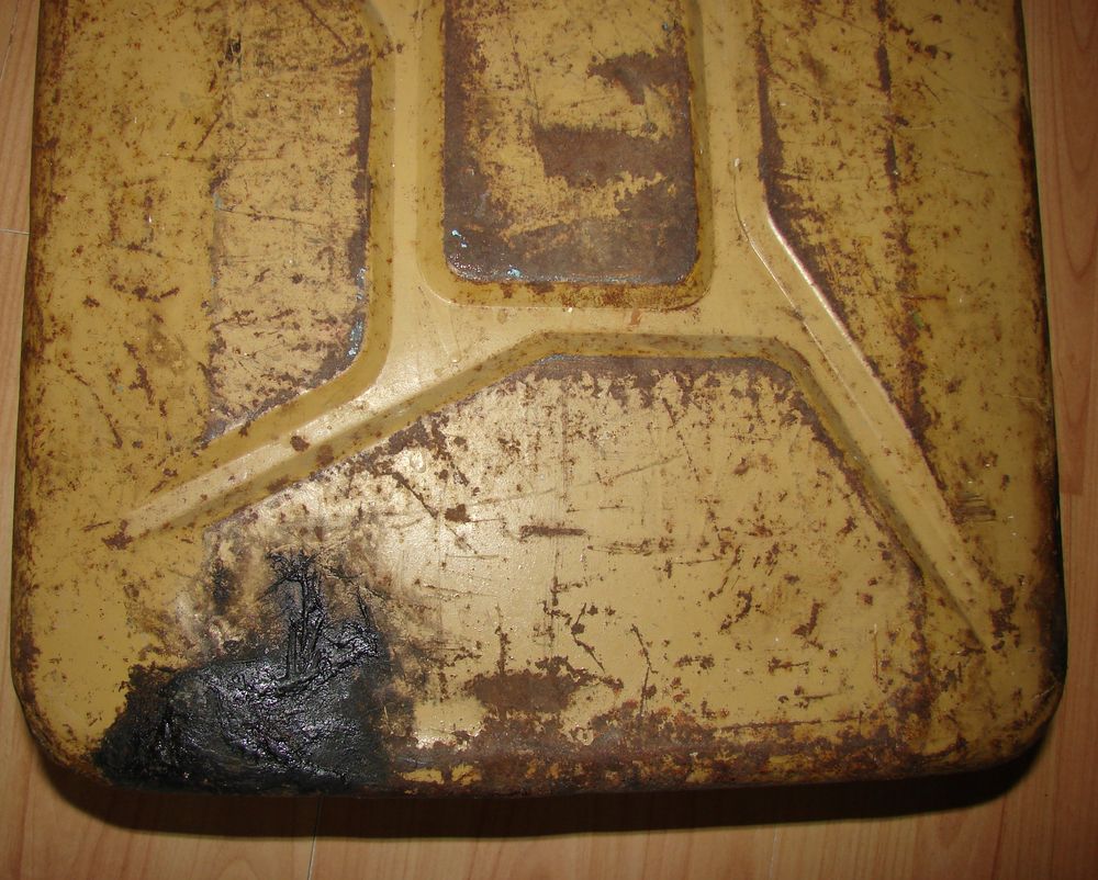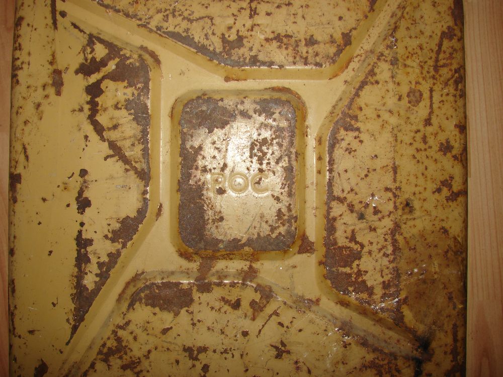English jerrycan marked War Department WD manufactured by ROC "Rubery Owen & Co" in Darlaston, dated 1943. A period repair made to the bottom of the jerrycan.
