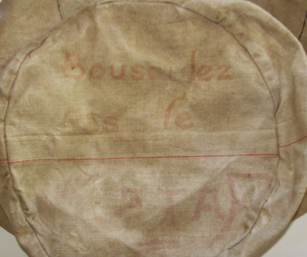 Duffel bag personalized by the owner, representing himself with his beautiful in the middle of a buoy and inscribed "TOI-MOI" on one side and on the other the coat of arms of the city of Toulon. On the bottom of the bag, the sailor wrote "Bousculez pas le Mataf, Don't push the Mataf", the mataf being the sailor in slang. Registration number of the sailor of the military port of Toulon, dated 1954 and manufacturing stamp of the duffel bag dated 1943.