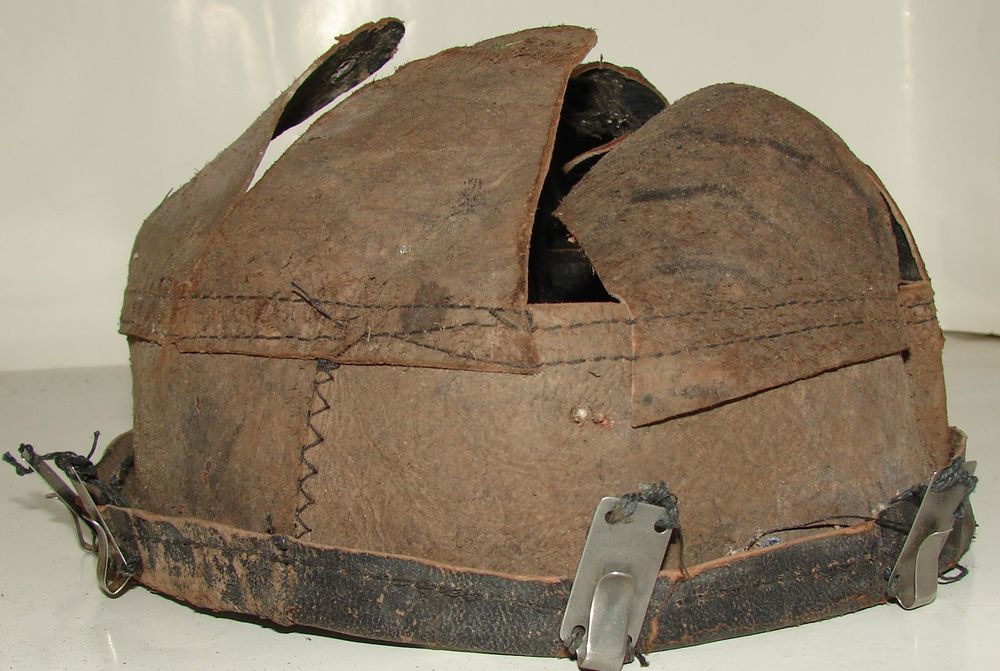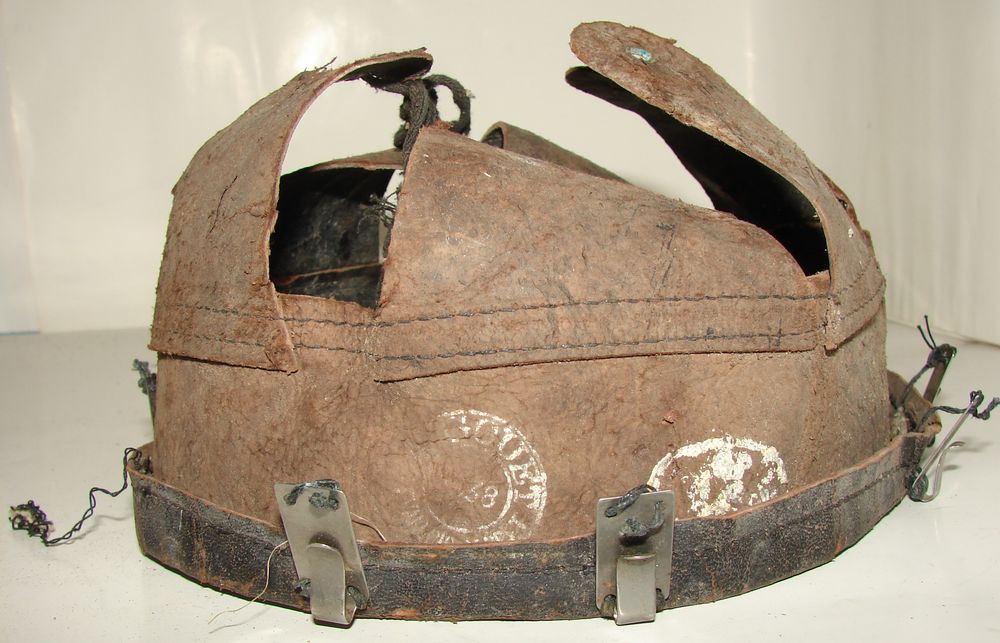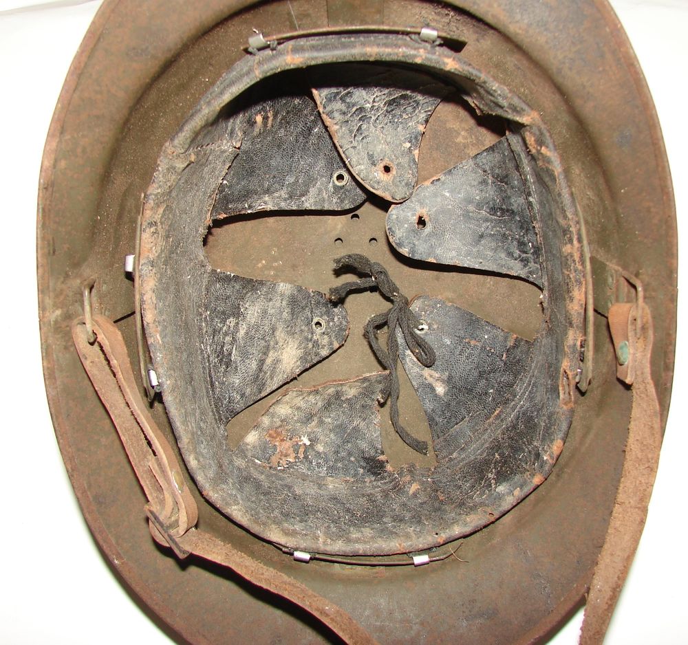 M26 infantry helmet, factory khaki color, Mle 37 badge, black leather liner. Two white stamps, on the round one, a date appears 38. Light brown chinstrap.