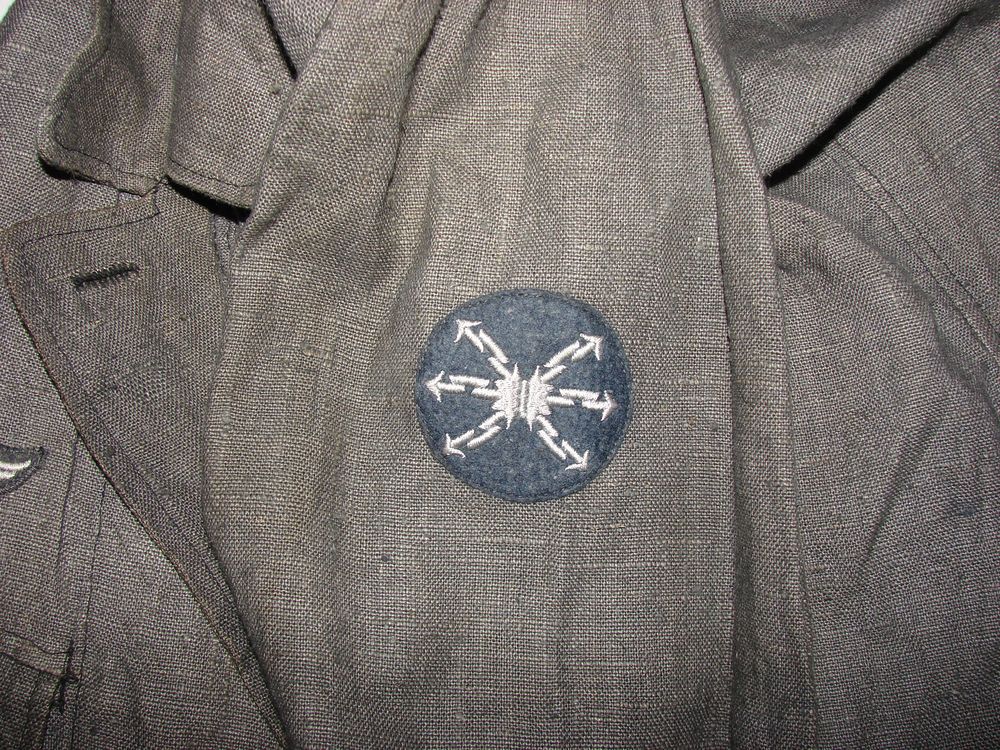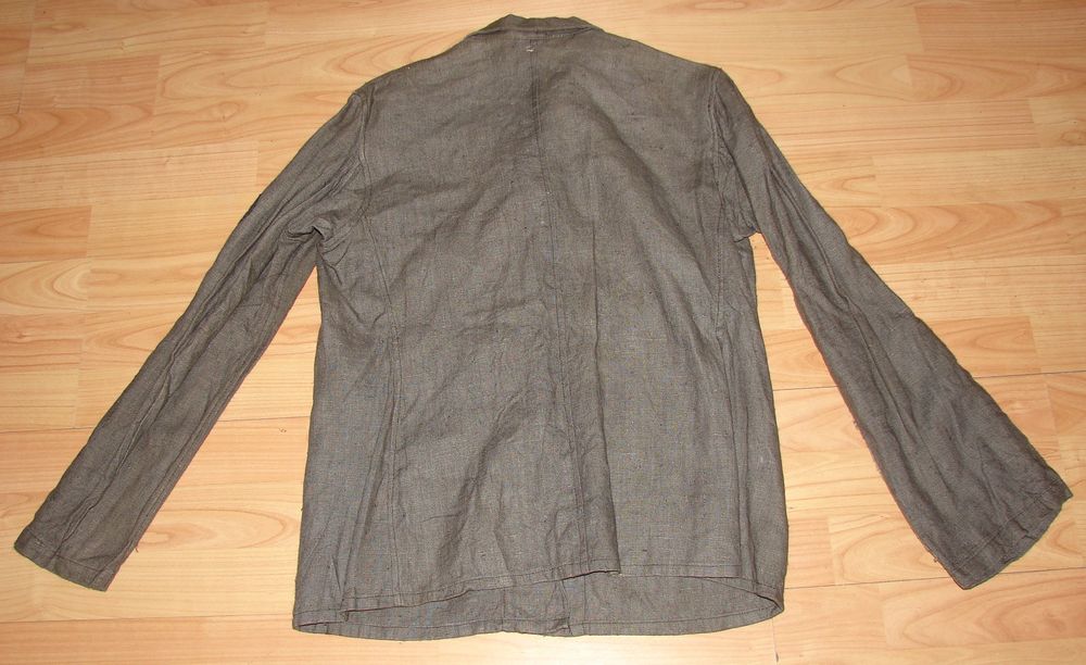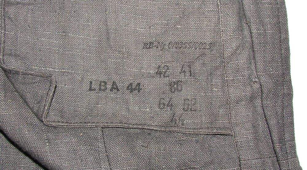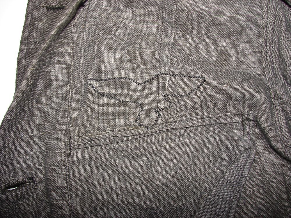 Luftwaffe Helferin summer jacket in gray cotton canvas. Machine-stitched eagle, blue metal buttons. Machine-stitched Luftwaffe radio insignia. Marked with RbNr: 0/0353/0025, measurements, LBA, and dated 44.