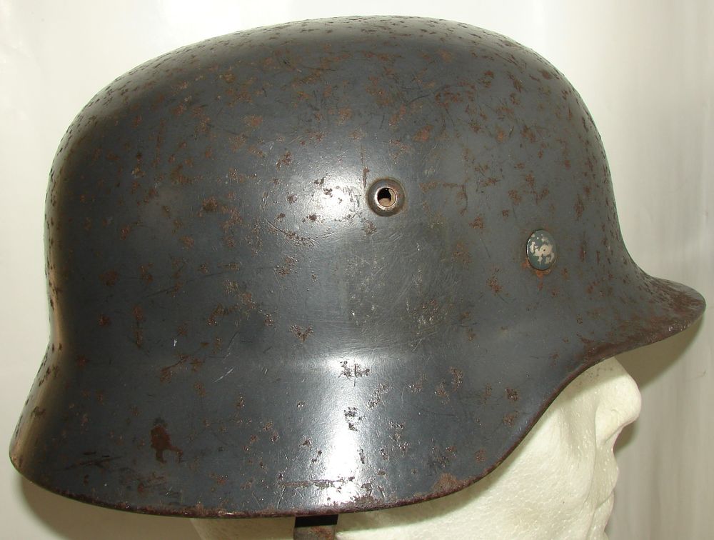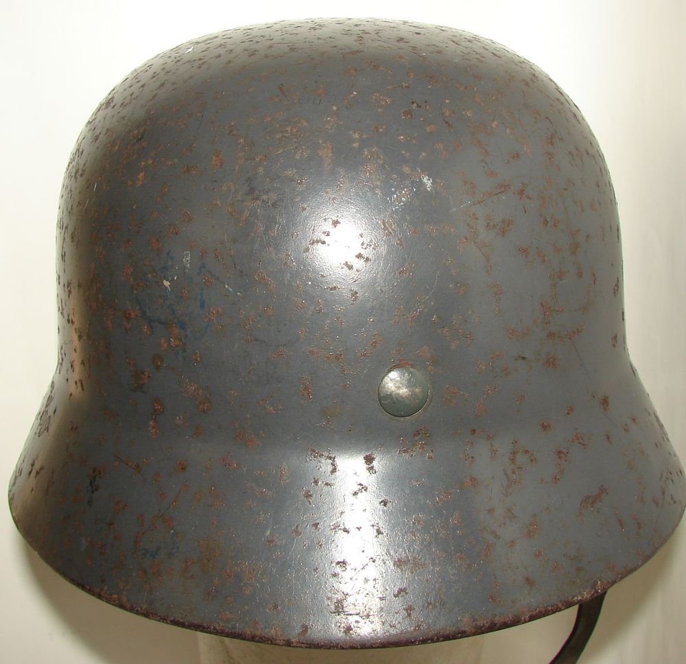 Luftwaffe M35 helmet, blue-grey in colour, with traces of the second type eagle and national colours. Helmet manufactured by Quist, size 66, steel sheet number 3478. Broken chinstrap.