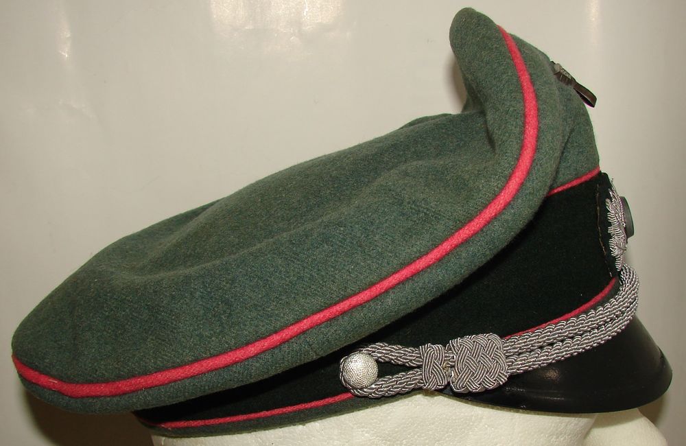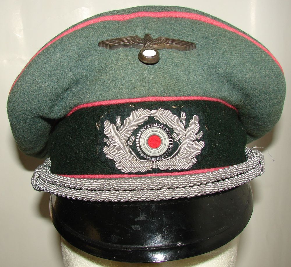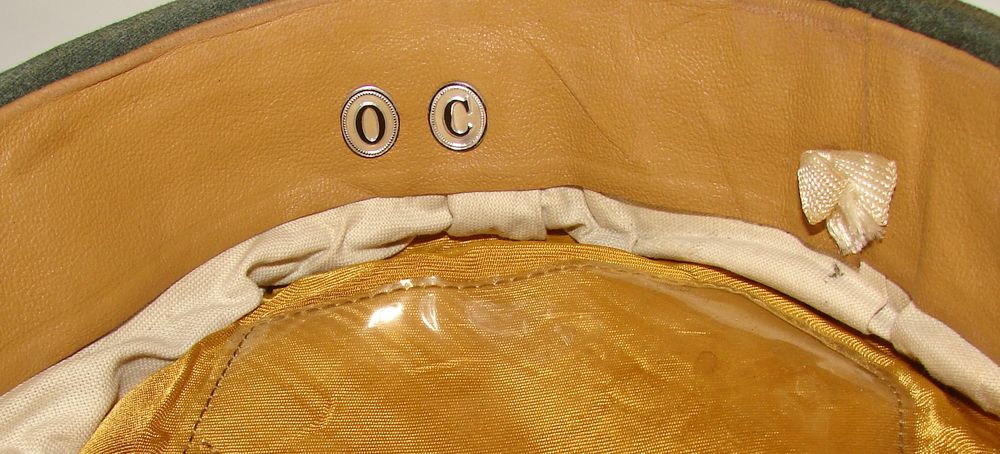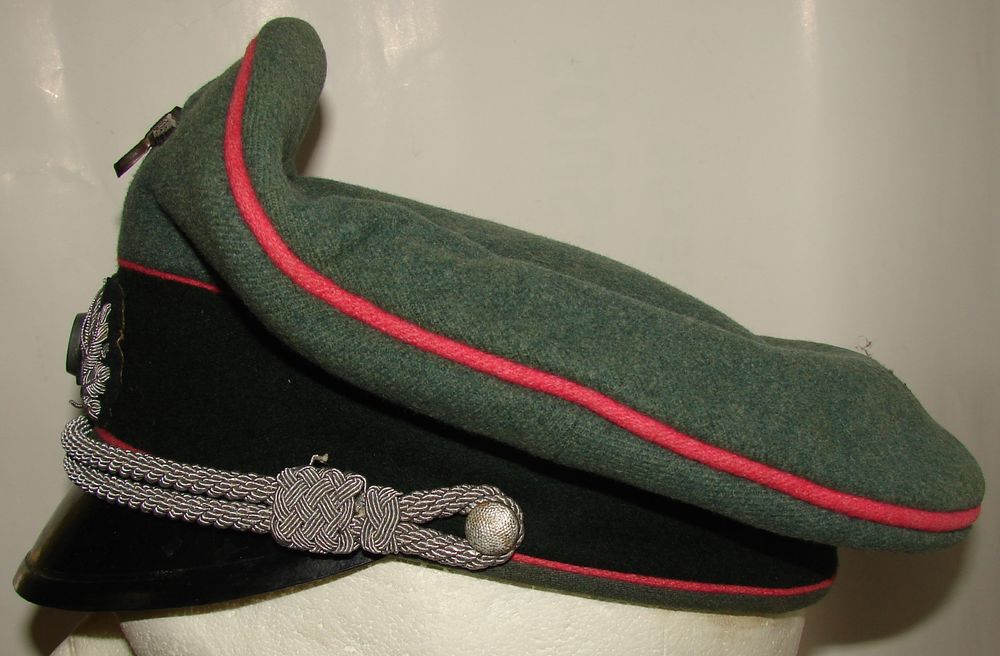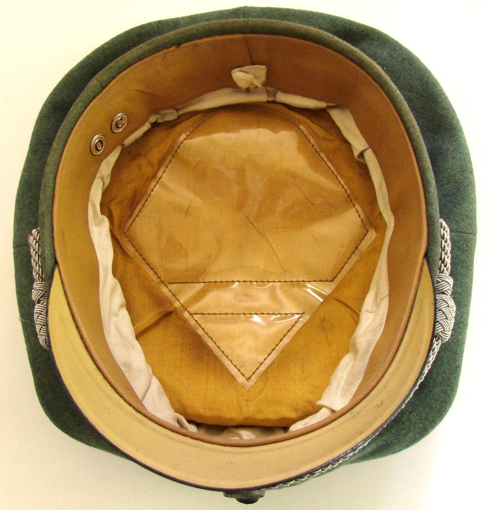 Panzer officer's cap in wool cloth, synthetic silk and cotton lining. Light brown leather sweatband. Presence of rhodoid. Metallic eagle, oak leaf in silver cannetille thread. Owner's initial. Pink piping of the armored troops. No markings. Size approximately 55/56.