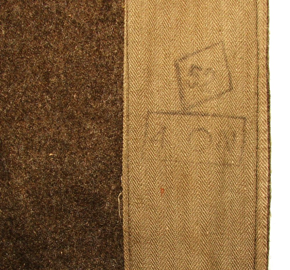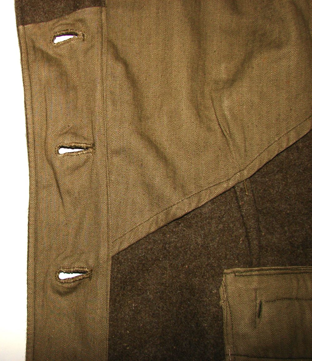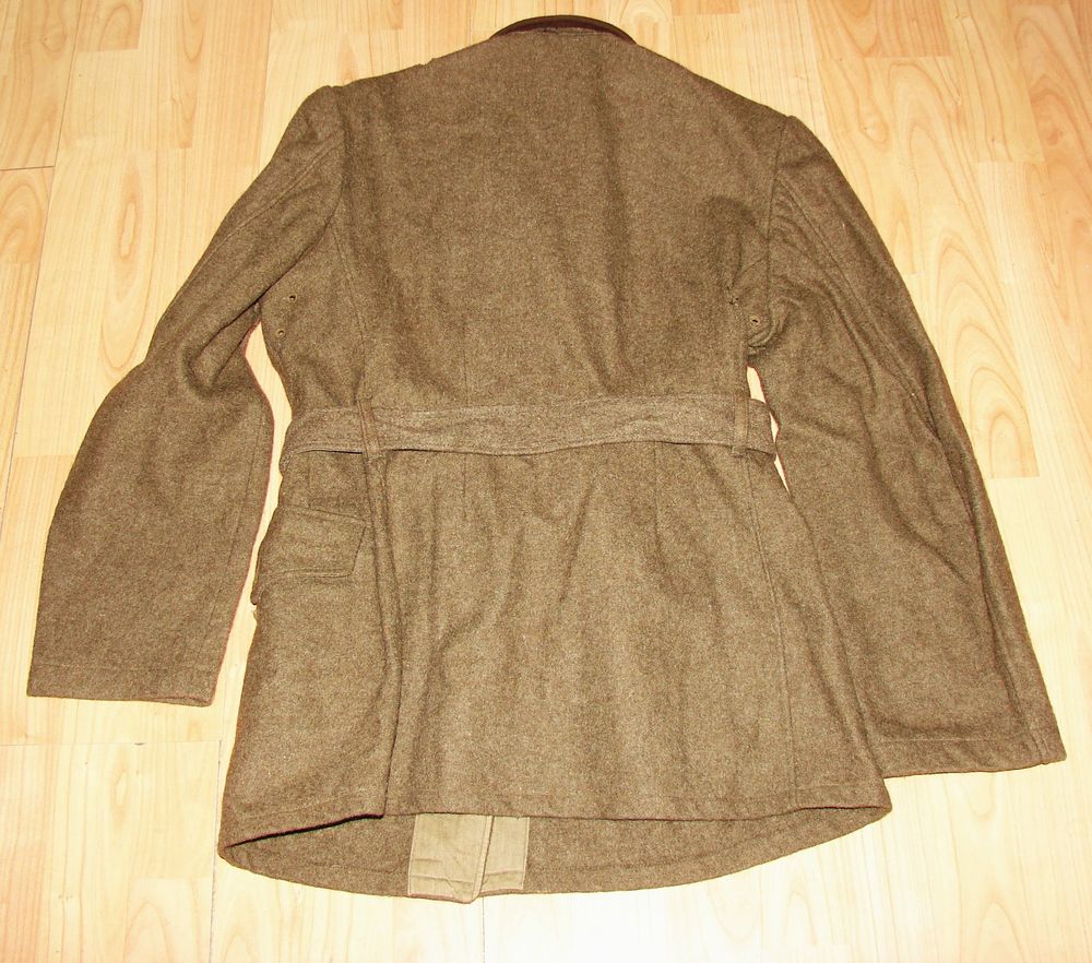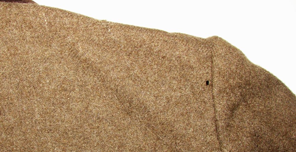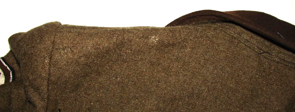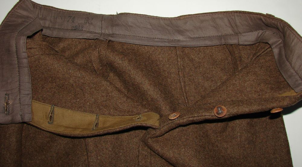 Brown wool uniform of RAD personnel. The jacket is lined at the chest with green cotton, and the pocket lining is green and white cotton. Size marking and RbNr: 0/0250/0354, "Deutsche Bekleidungs Werkstätten, German Clothing Workshops Berlin". RAD XIV badge sewn on the right sleeve, Halle-Merseburg region. Belt present with an iron buckle. Curious stamp "52 in a diamond and 4 ON" on the jacket lapel, possibly indicating assignment to an RAD camp ? A decorative loop. Compressed cardboard buttons marked "ges gesch H.S.B." Three ventilation holes under the arms. A few repaired snags.