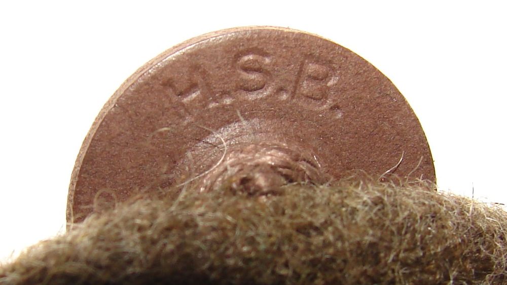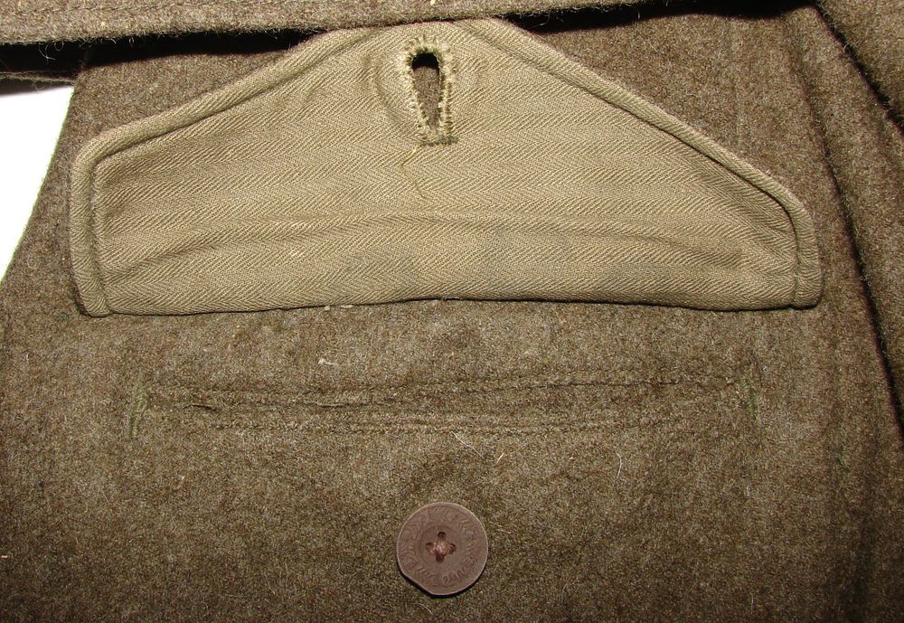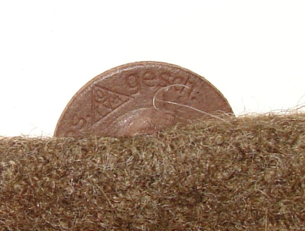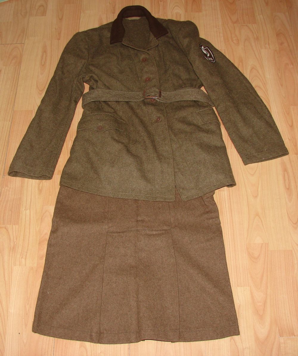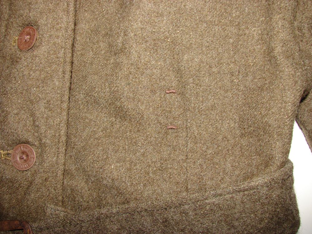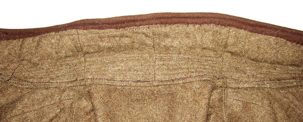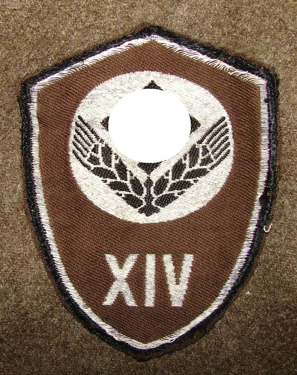 Brown wool uniform of RAD personnel. The jacket is lined at the chest with green cotton, and the pocket lining is green and white cotton. Size marking and RbNr: 0/0250/0354, "Deutsche Bekleidungs Werkstätten, German Clothing Workshops Berlin". RAD XIV badge sewn on the right sleeve, Halle-Merseburg region. Belt present with an iron buckle. Curious stamp "52 in a diamond and 4 ON" on the jacket lapel, possibly indicating assignment to an RAD camp ? A decorative loop. Compressed cardboard buttons marked "ges gesch H.S.B." Three ventilation holes under the arms. A few repaired snags.