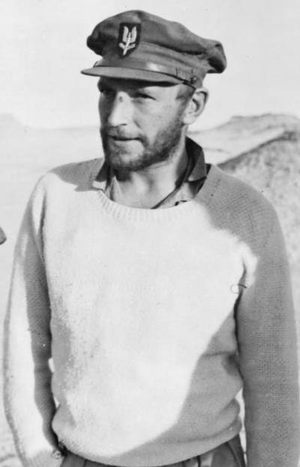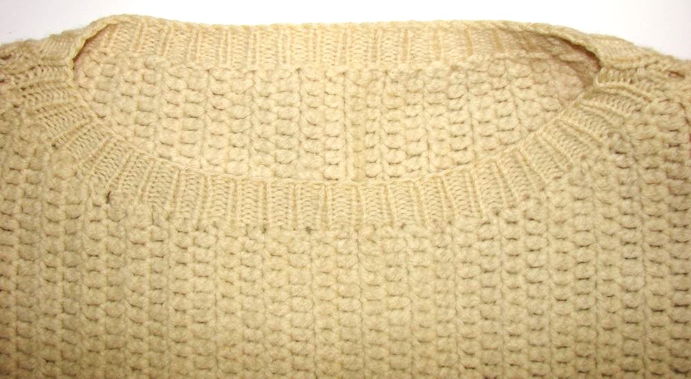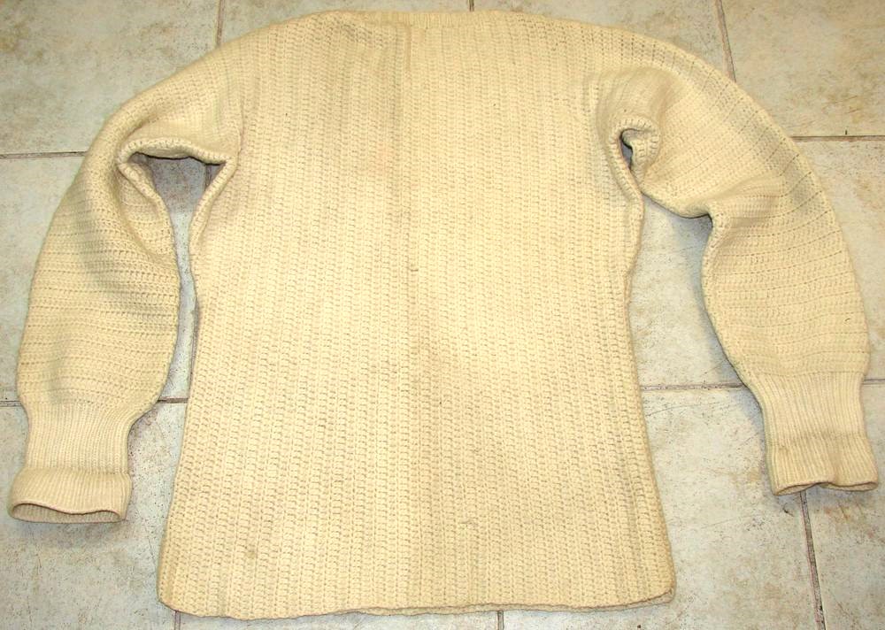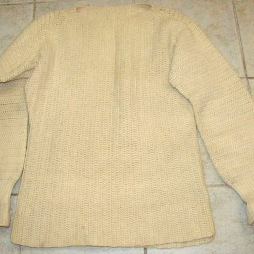 Short-necked pullover in large white woolen mail from the Royal Navy, also called "Submariner Sweater, submariner sweater". No marking. In illustration image, a color photo of an English submariner dated 1942.