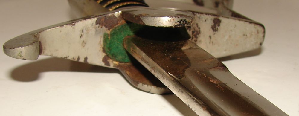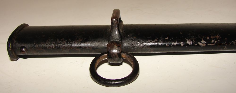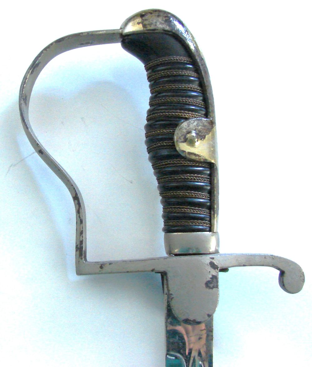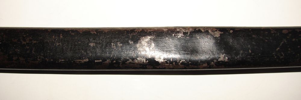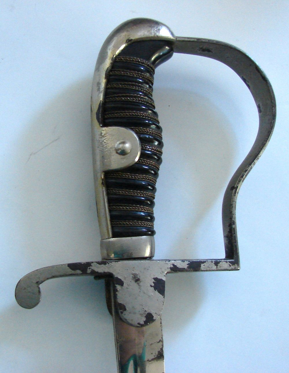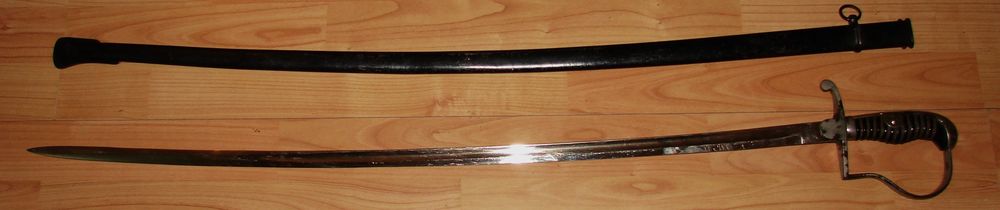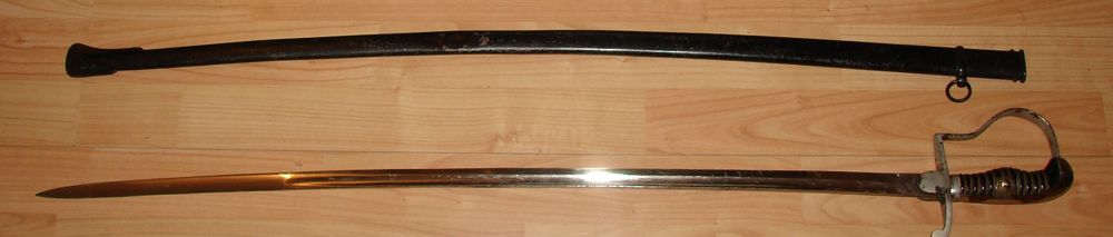 Nickel-plated trooper's saber without markings, watermark in good condition, clean blade, with sword knot present. Scabbard painted black, slightly dented in the middle.