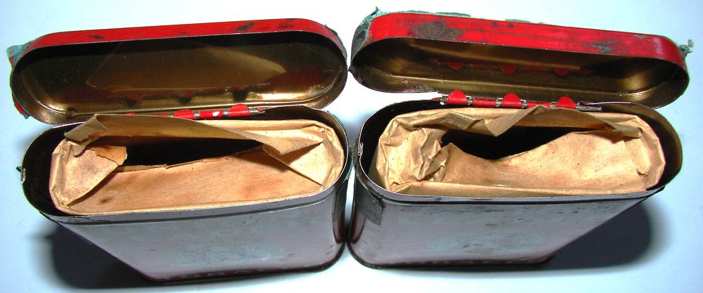 Metal tobacco tins, still half full, with tax stickers.