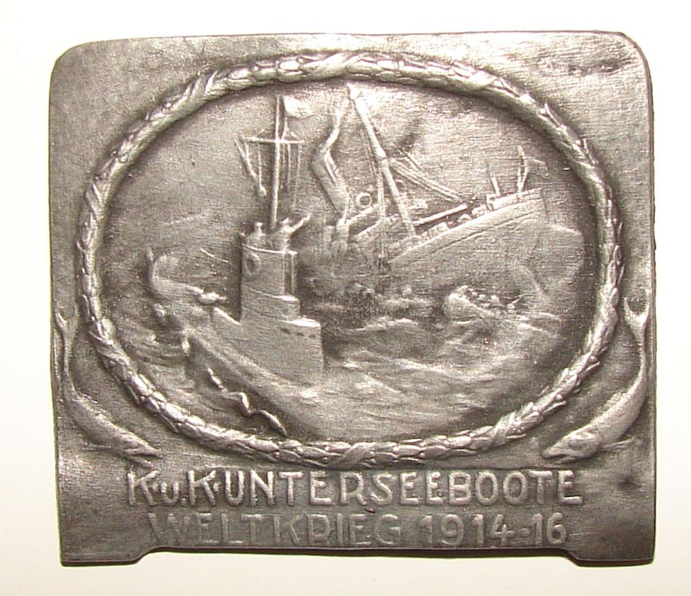 German WWI submarine cap badge, showing a submarine sinking a ship. Zinc plate marked "K.u.K UNTERSEEBOOTE WELTKRIEG 1914-16, KAISERLICHE und KÖNIGLICHE UNTERSEEBOOTE WELTKRIEG 1914-16, IMPERIAL AND ROYAL SUBMARINES WORLD WAR 1914-16"